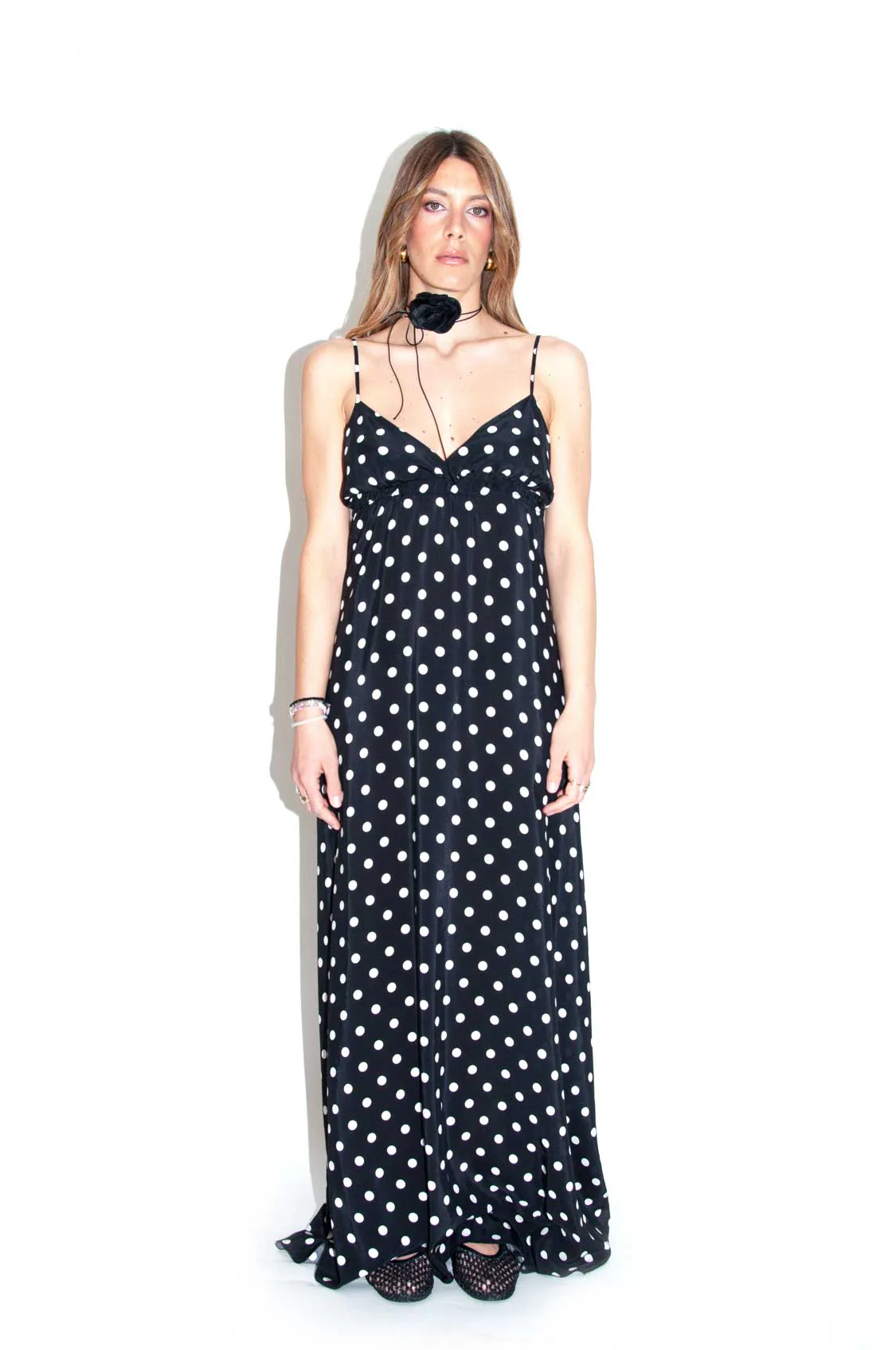 Questo abito รจ un modello impero con scollo a V e spalline sottili incrociate sul retro e regolabili tramite coulisse. Sul retro busto รจ presente un elastico per maggiore comfort. Realizzato in tessuto fluido e morbido presenta un fondo nero e pois bianco che richiama un po il gusto retrรฒ. E’ un abito perfetto per le tue vacanze estive portato con una ciabattina flat semplice e minimal o per la sera gioiello. Portato con un tacco alto e una borsa preziosa รจ un outfit ideale per una cerimonia all’aperto per la stagione piรน calda. 51% viscosa 49% ecoviscosa