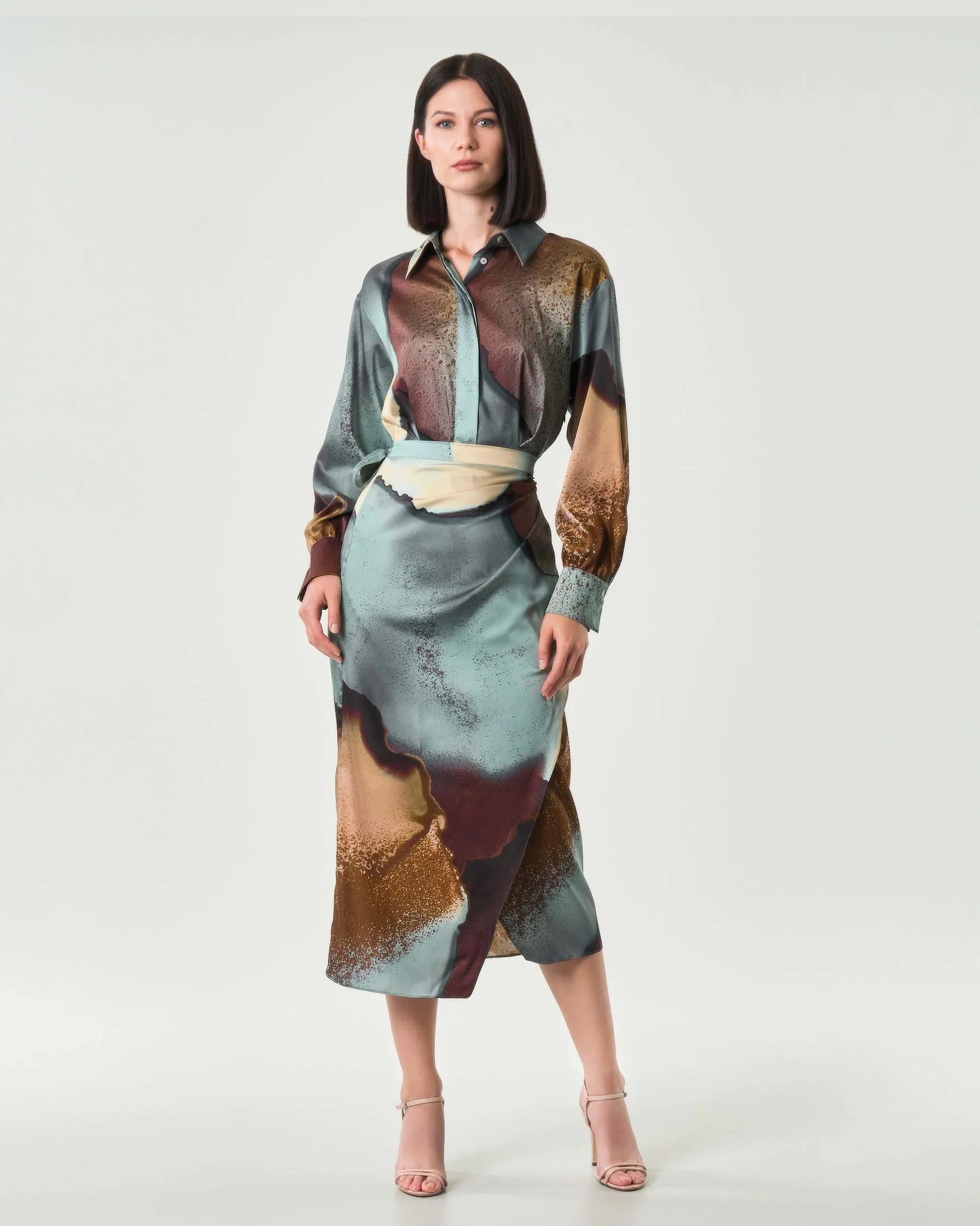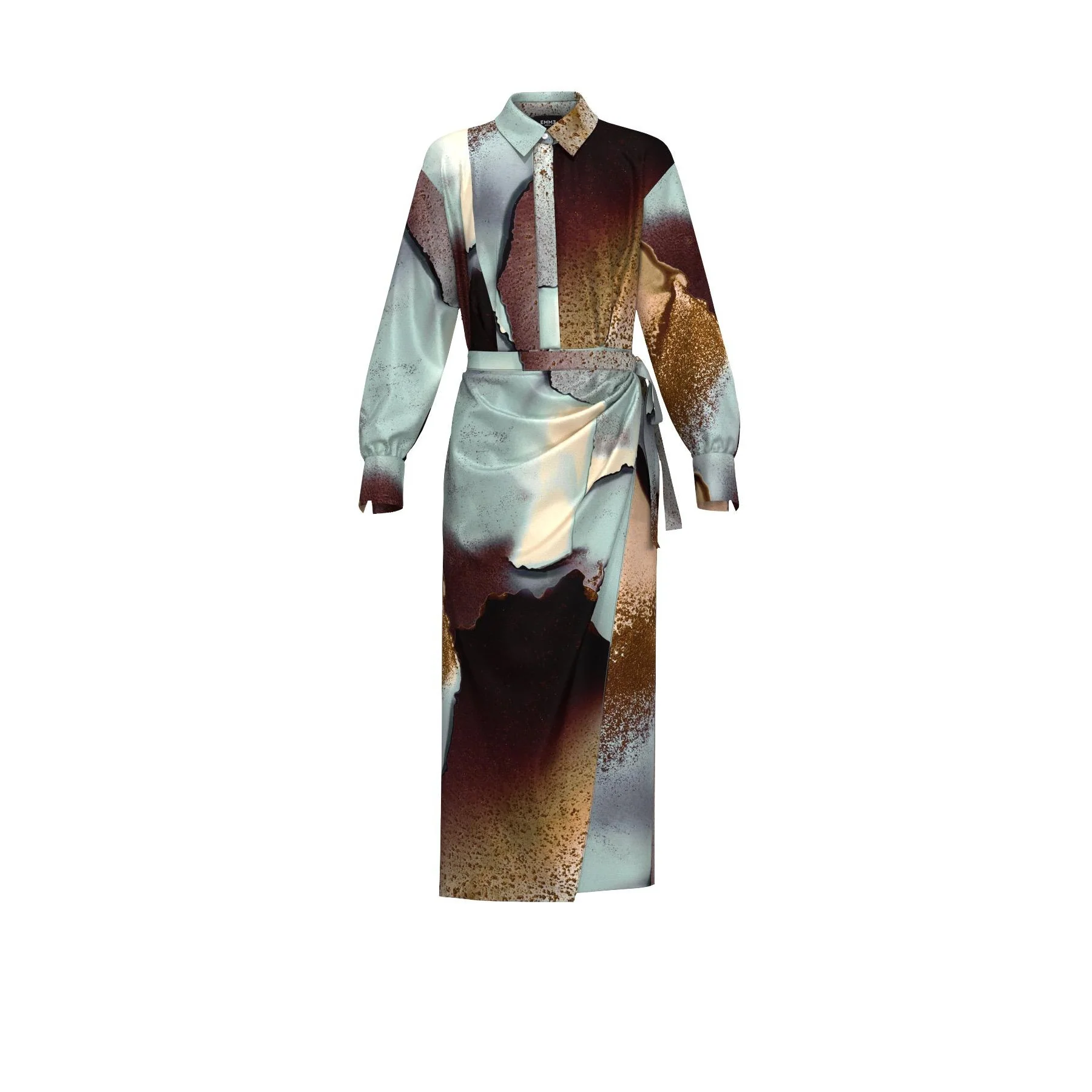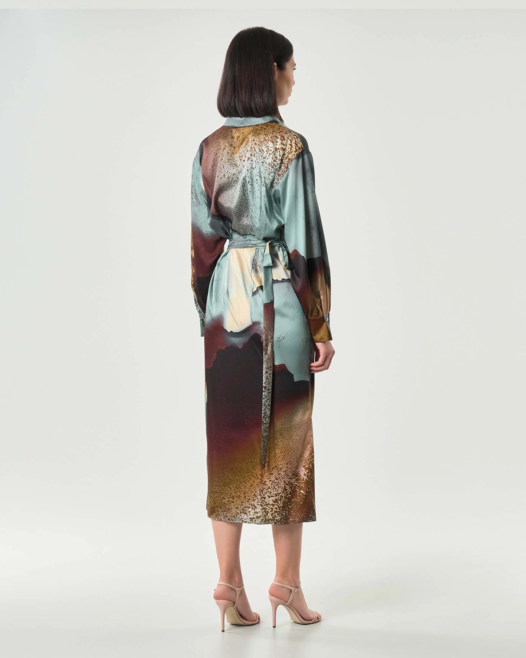 Abito “Meringa” color carta da zucchero in twill tecnico, caratterizzato da una macro stampa astratta nei toni del cielo e della terra. Modello dal fit femminile sfiancato in vita, con collo a camicia e abbottonatura nascosta fino al punto vita, zip laterale e polso alto con bottone e piccolo arriccio. La gonna a portafoglio con fusciacca laterale dona movimento ed eleganza. Realizzato con tessuto contenente oltre il 50% di poliestere riciclato.