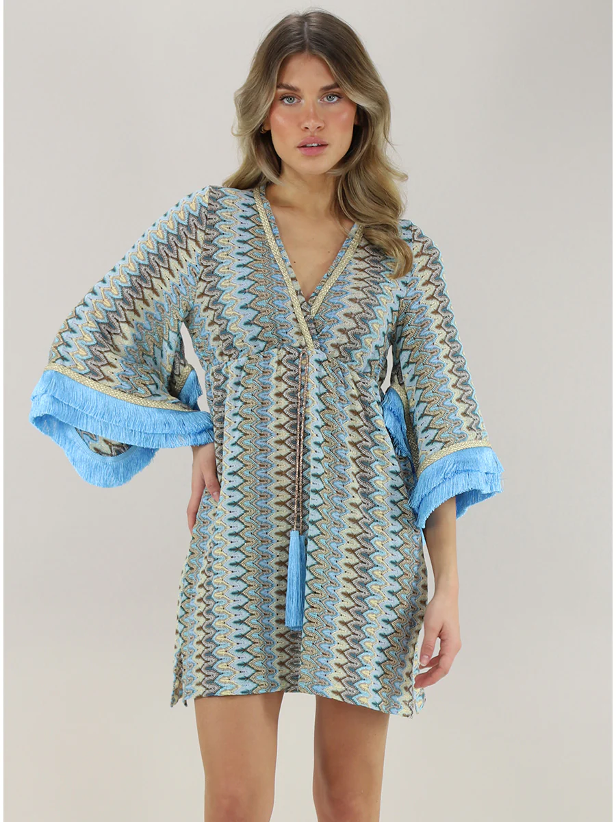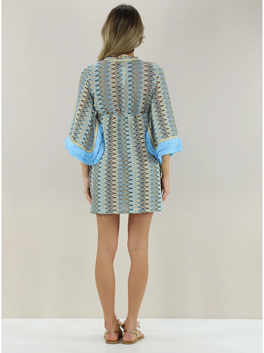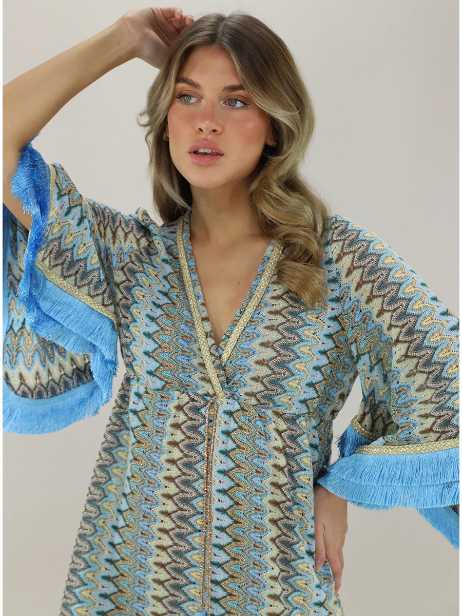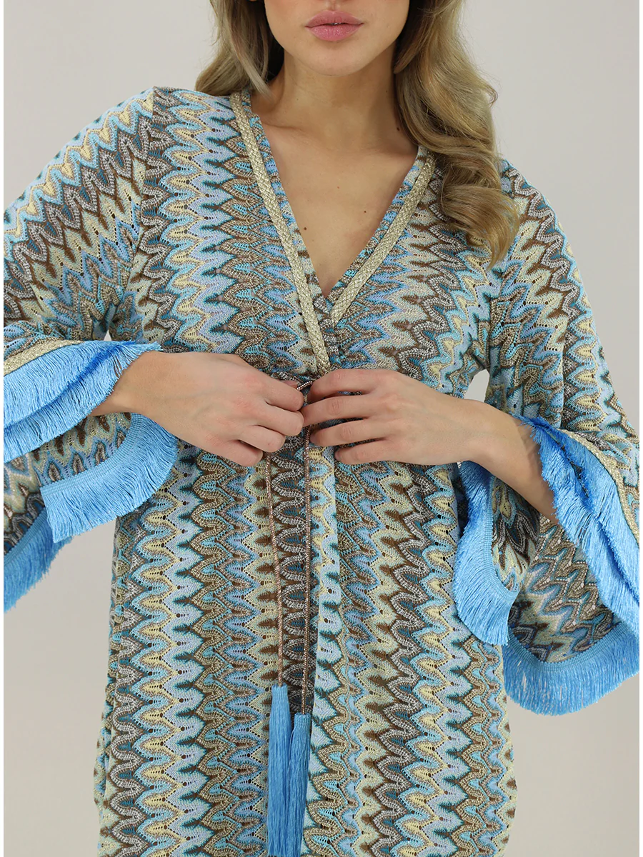 In maglia In pizzo Effetto laminato Ampio Svasatura Scollo a V Maniche a 3/4 Maniche ampie Applicazioni: Profilo con frange, Elastico sul retro, Fantasia, Applicazioni a contrasto, Spacchi sul fondo, Dettagli gold Taglia indossata in foto: S Altezza modella: 1,70m Made in Italy Composizione: Cotone, Elastan, Poliestere, Viscosa