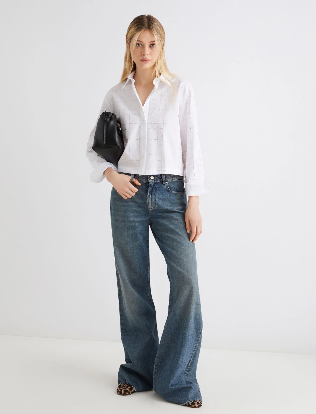 Il minimalismo della camicia in popeline si trasforma in capo trendy, grazie ai cristalli applicati e alla linea boxy sul busto. Da indossare in libertร con denim, pantaloni sartoriali o longuette colorate.