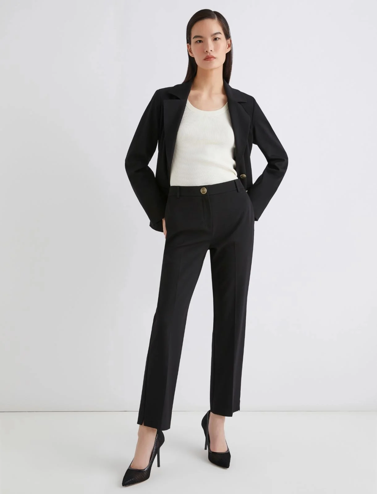Tutta l’eleganza del pantalone chino, in versione comfo-lux: nuova proposta in jersey punto Milano, morbido e flessibile al movimento. Da indossare con blazer coordinato per un nuovo livello di stile.