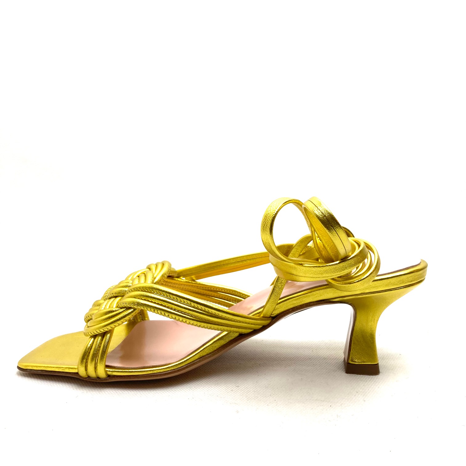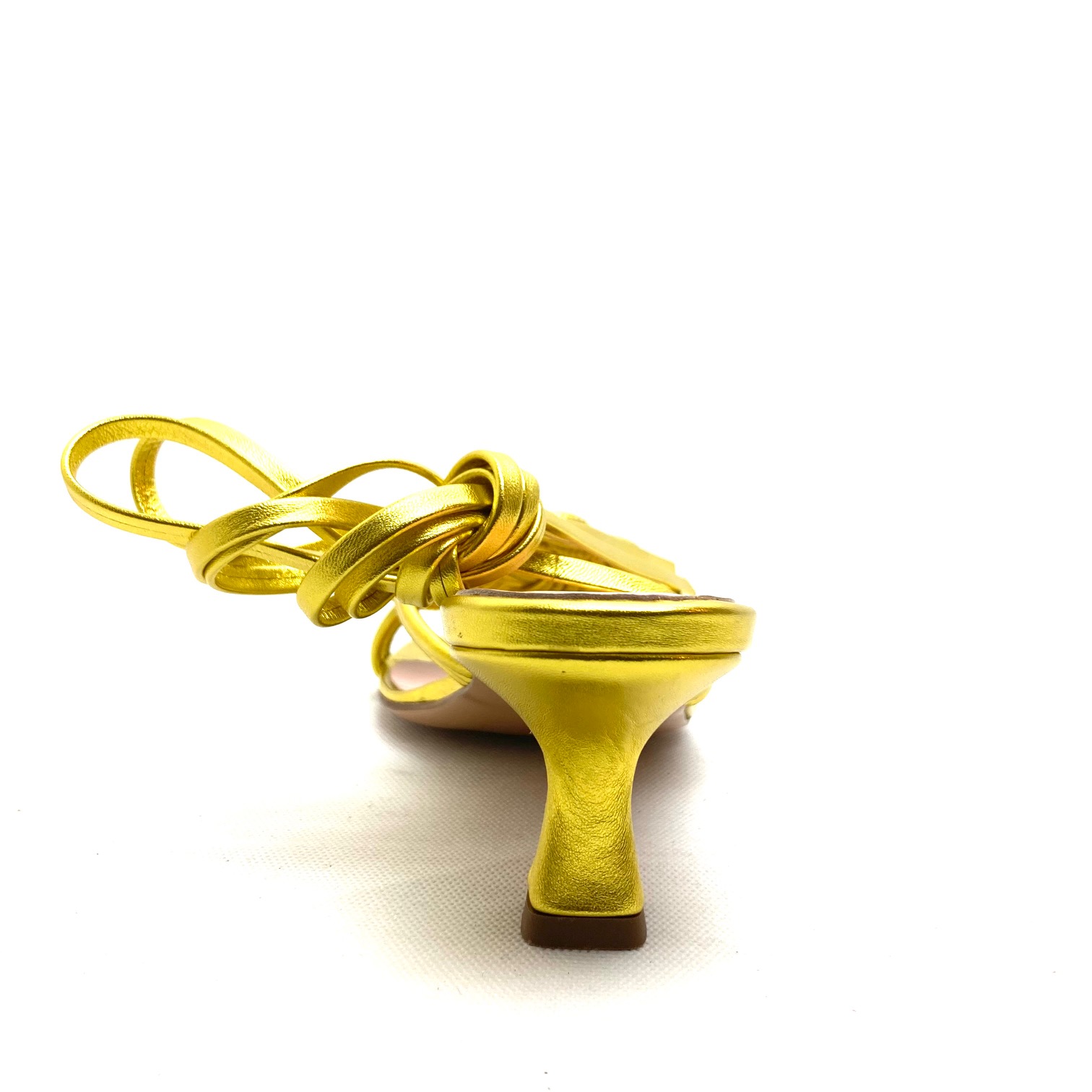 Sandalo in pelle laminata lime con motivo intrecciato e legatura alla schiava, Sottopiede imbottito in pelle, suola in cuoio antiscivolo, tacco a rocchetto cm 6 fasciato pelle. 100% Made in Italy.