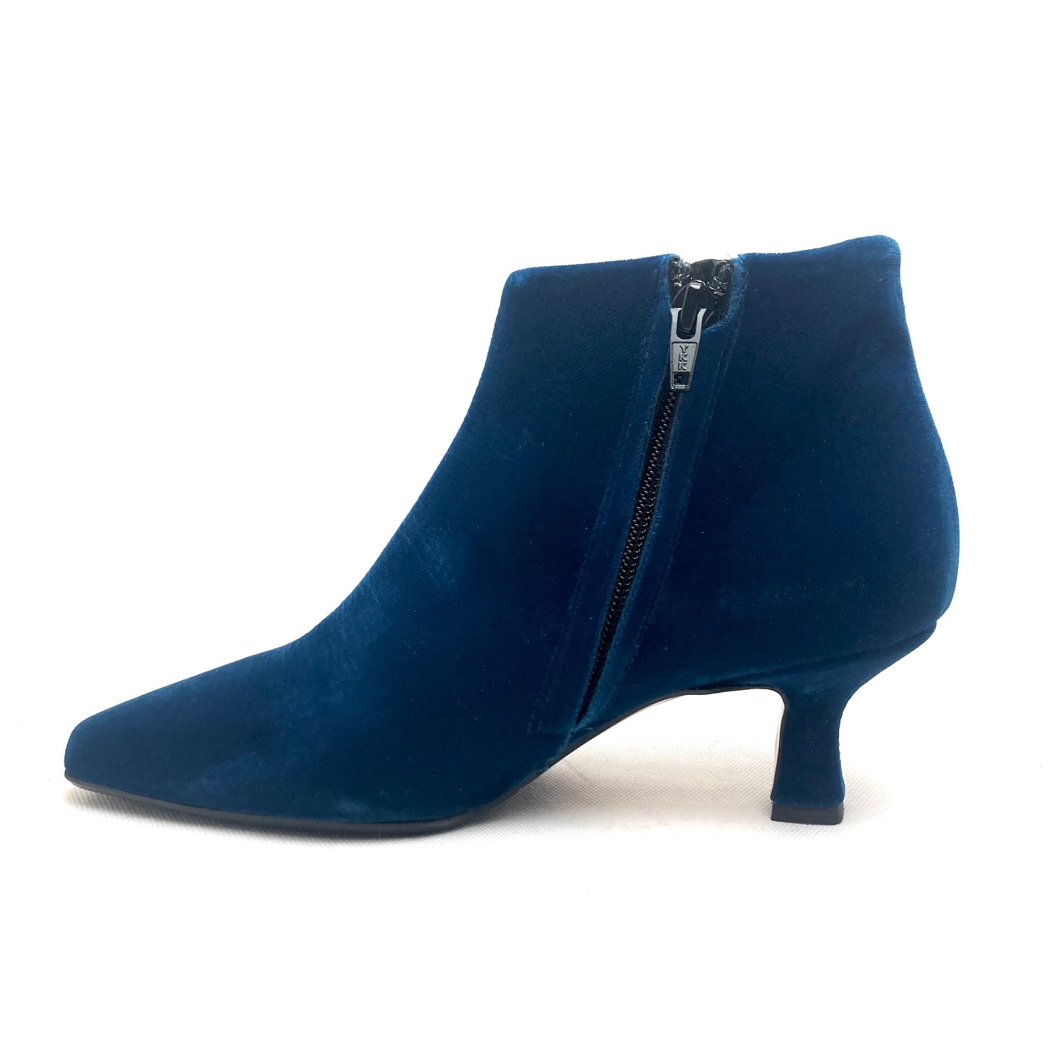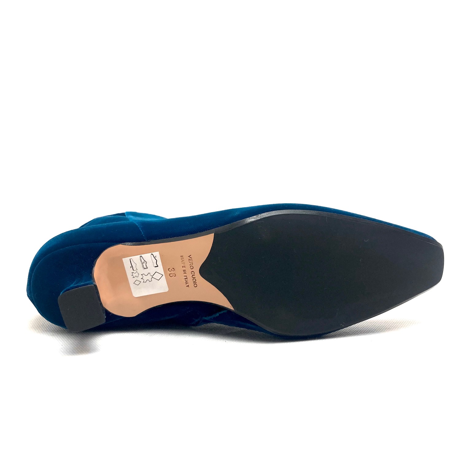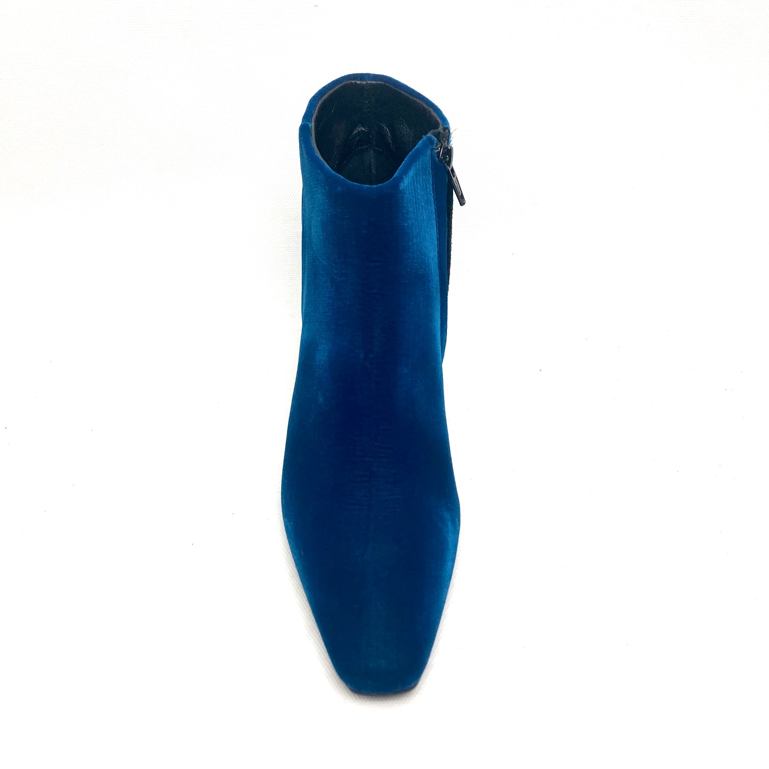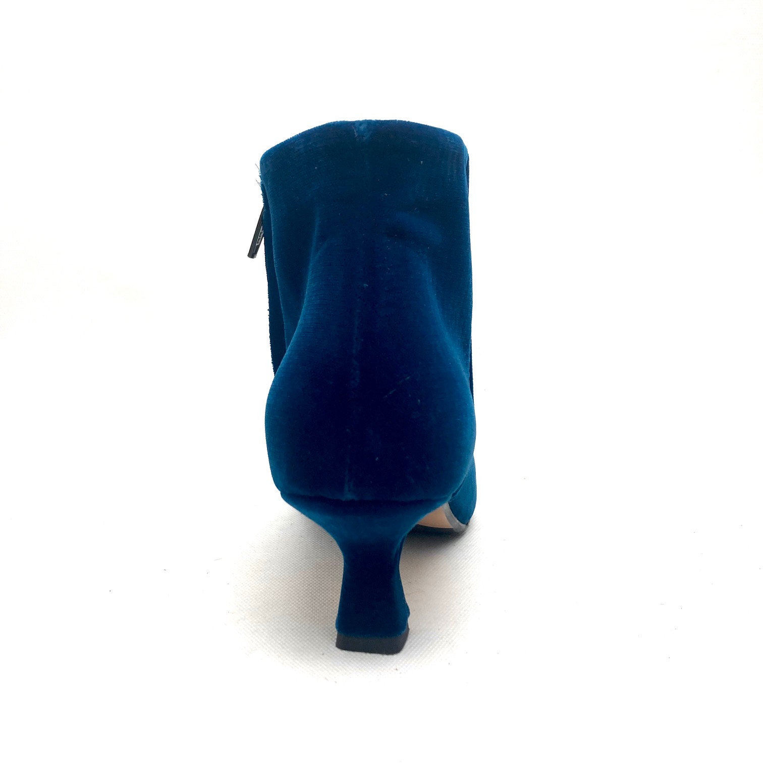 Stivaletto alla caviglia in velluto petrolio, forma sfilata ma punta leggermente squadrata. Fodera pelle e zip interna, tacco a rocchetto h cm 5 suola in cuoio e gomma.