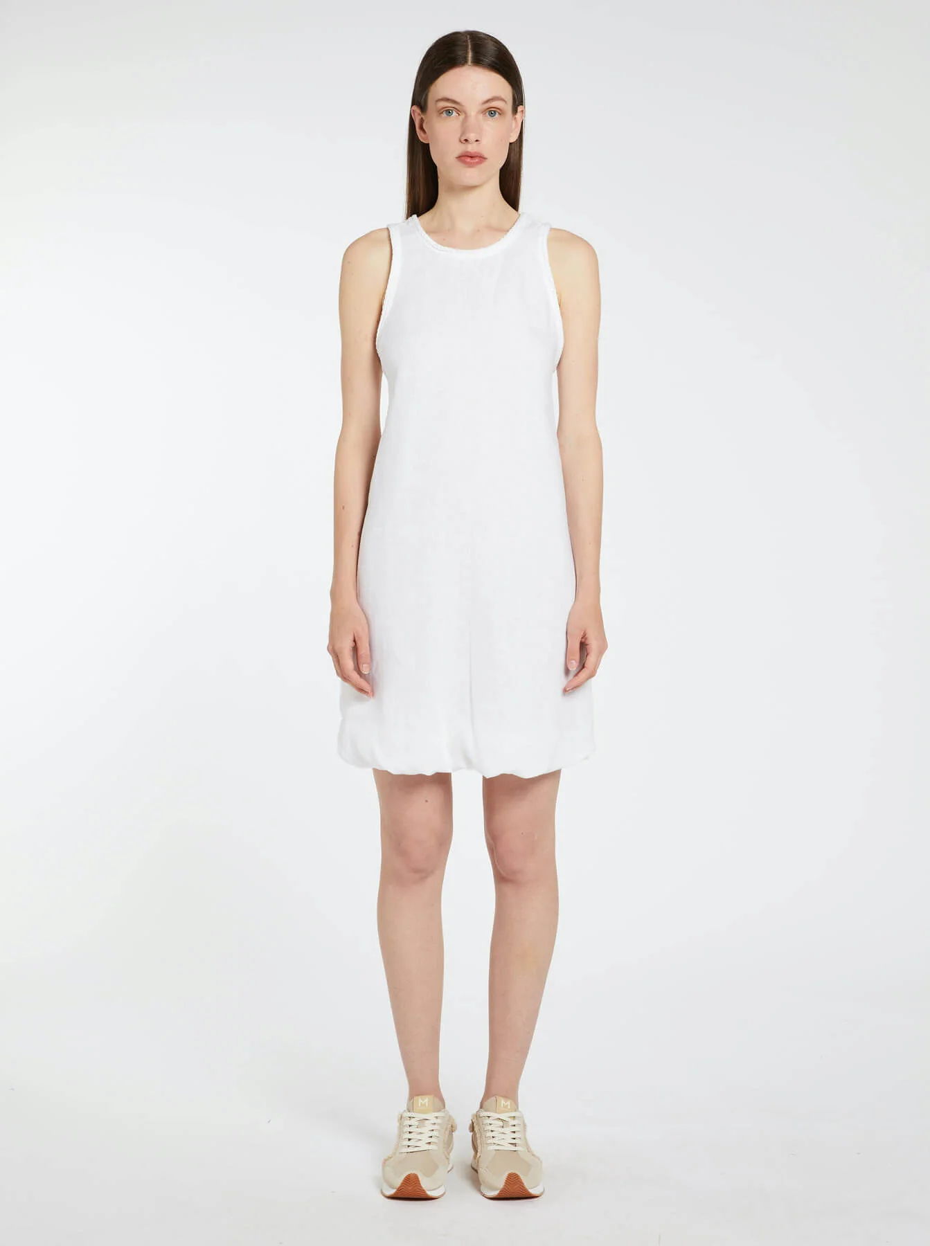 Abito in tela di puro lino. Fit dritto, svasato al fondo. Scollo a giro sul davanti, con apertura e spalline sul retro. Fondo a palloncino Colore: bianco ottico Composizione: 100% Lino