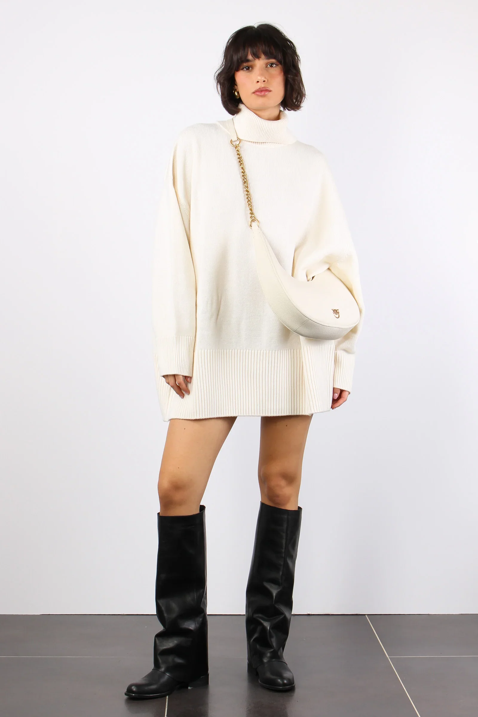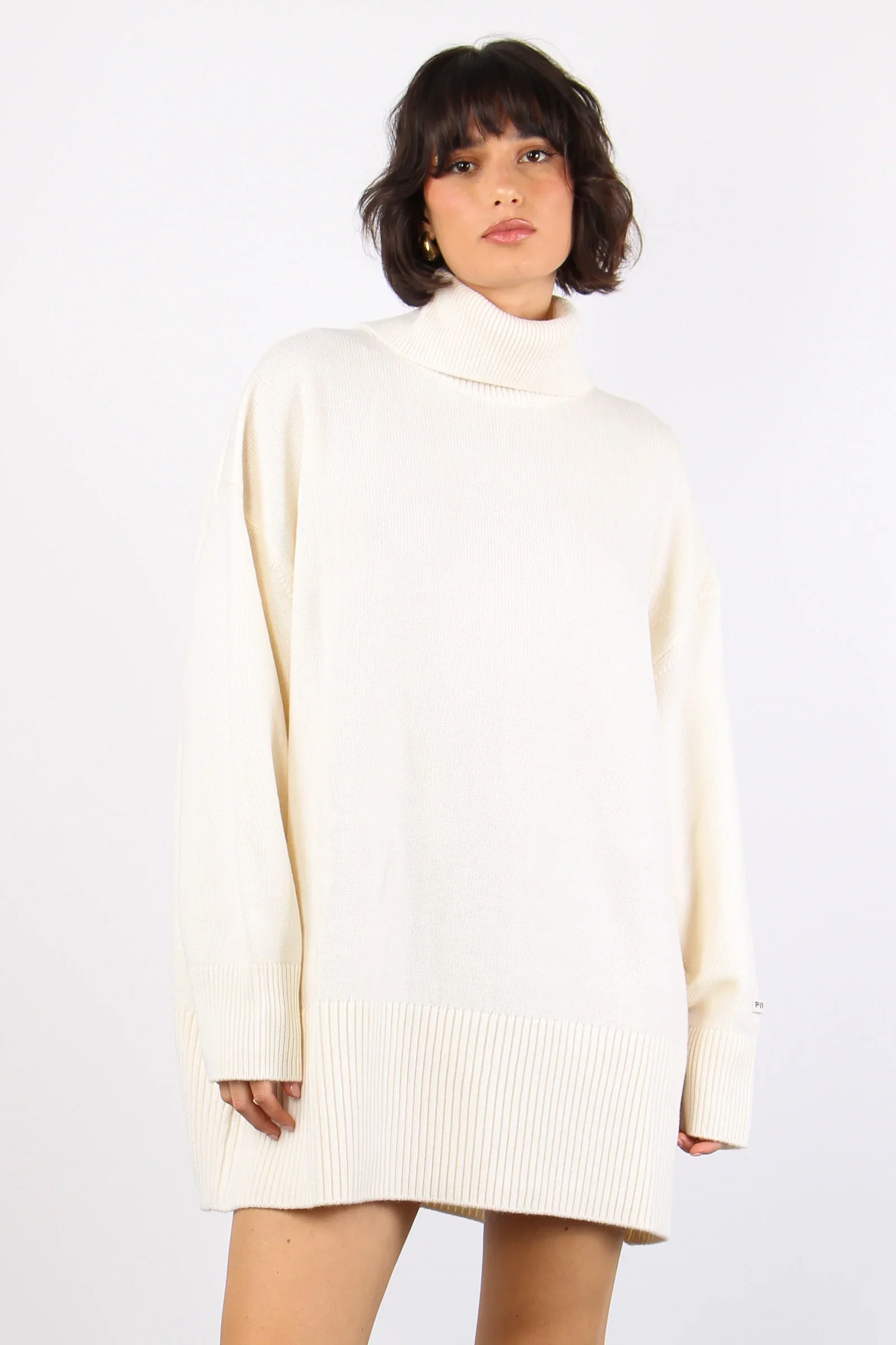 PINKO Abito corto Asian Caratteristiche bianco lana design lavorato a maglia collo alto maniche lunghe applicazione sulla manica con logo orlo e polsini a coste lunghezza sopra il ginocchio Composizione lana 100% Istruzioni per il lavaggio Lavare a mano