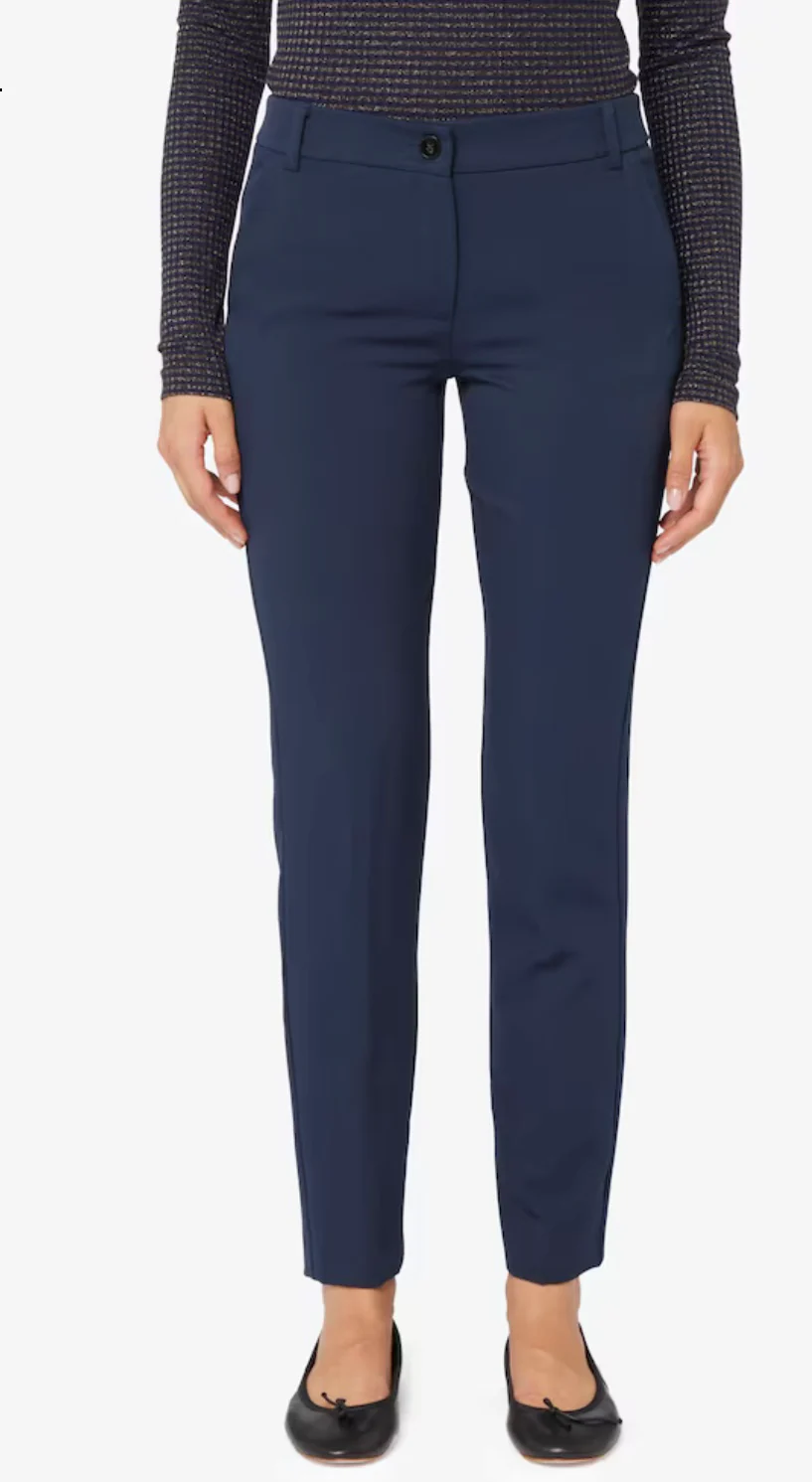 Pantaloni realizzati in tessuto tecnico stretch dalla linea slim. Chiusura con bottone e zip nascosta, tasche alla francese. Piega stirata fronte e retro. Lunghezza 100 cm.