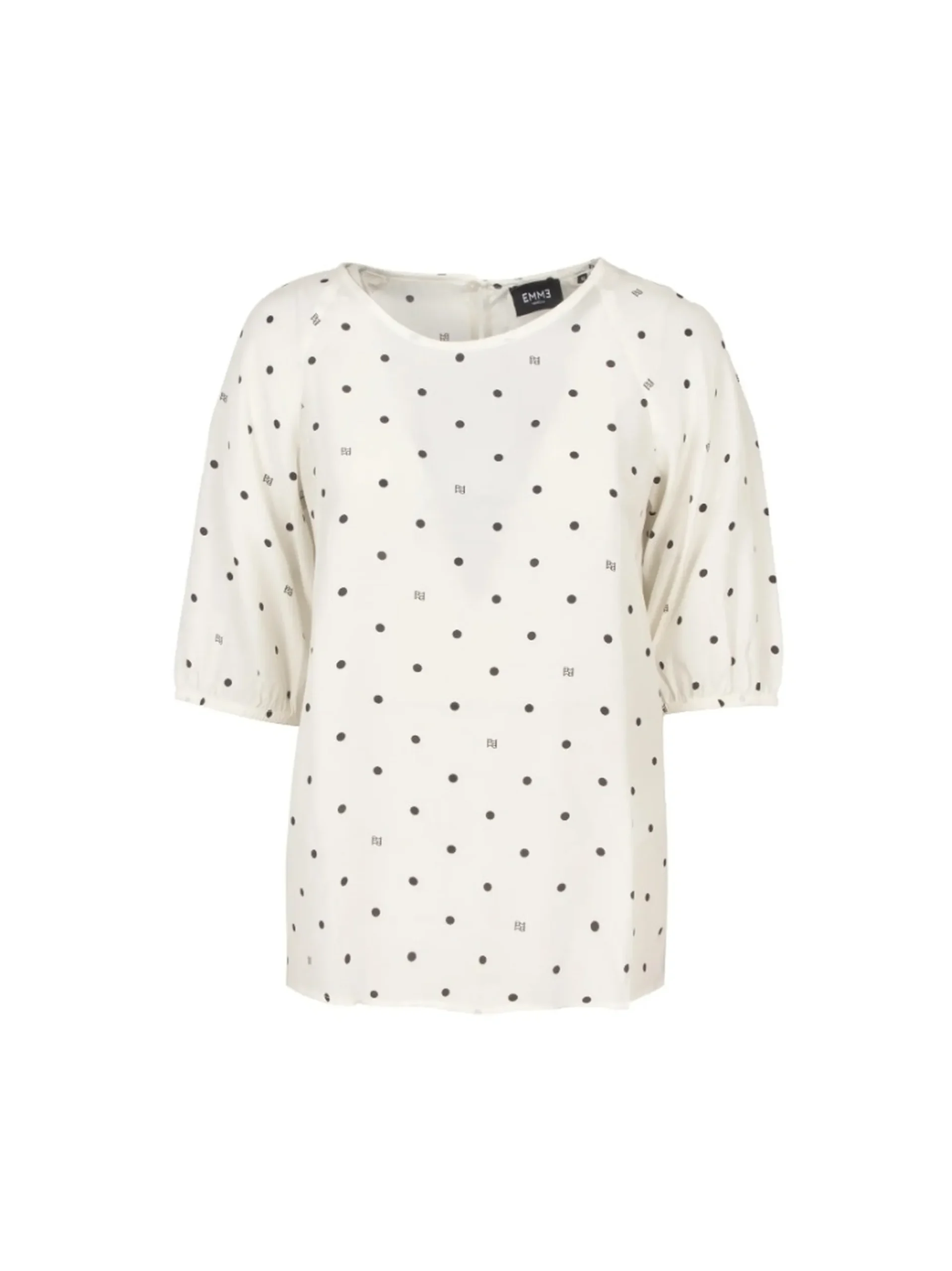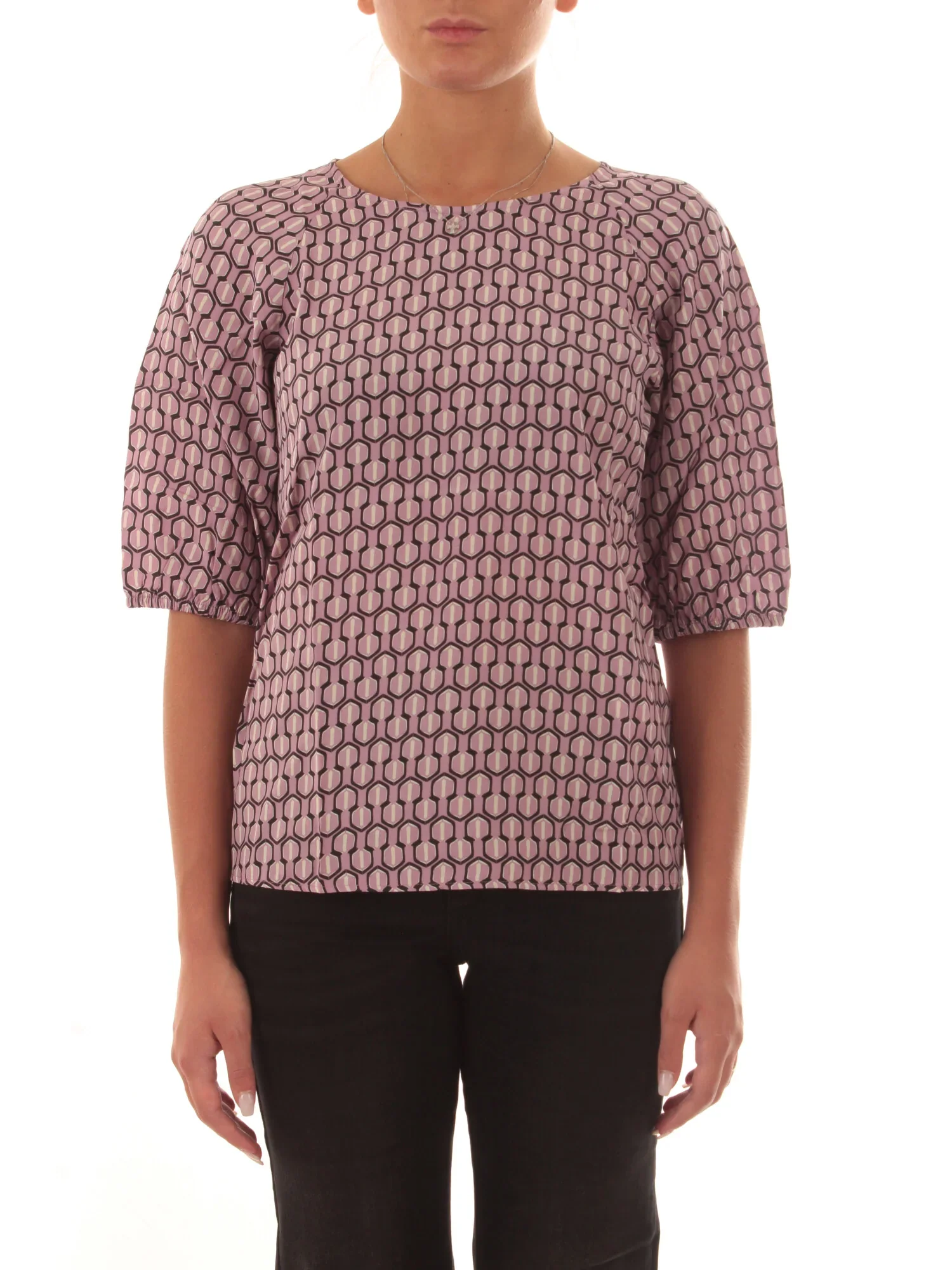 Blusa in viscosa a fantasia, linea dritta. Scollo rotondo, maniche raglan a tre quarti. Chiusura a goccia con bottone sul retro. Lunghezza 60 cm.