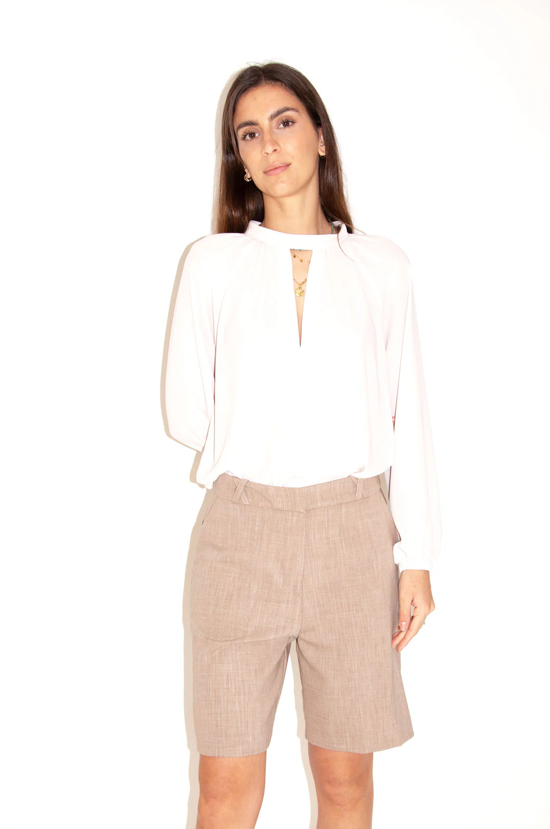 Questo bermuda รจ un ottima alternativa a chi preferisce indossare pantaloni ma con stile e praticitร . Realizzato in tessuto maschile il modello รจ a vita alta con piega centrale e passanti incrociati. Abbinato alla sua giacca doppiopetto e ad una camicia bianca รจ un oufit in perfetto stile garรงonne. La modella indossa la taglia 42/S 52% poliestere 45% viscosa 3% elastane