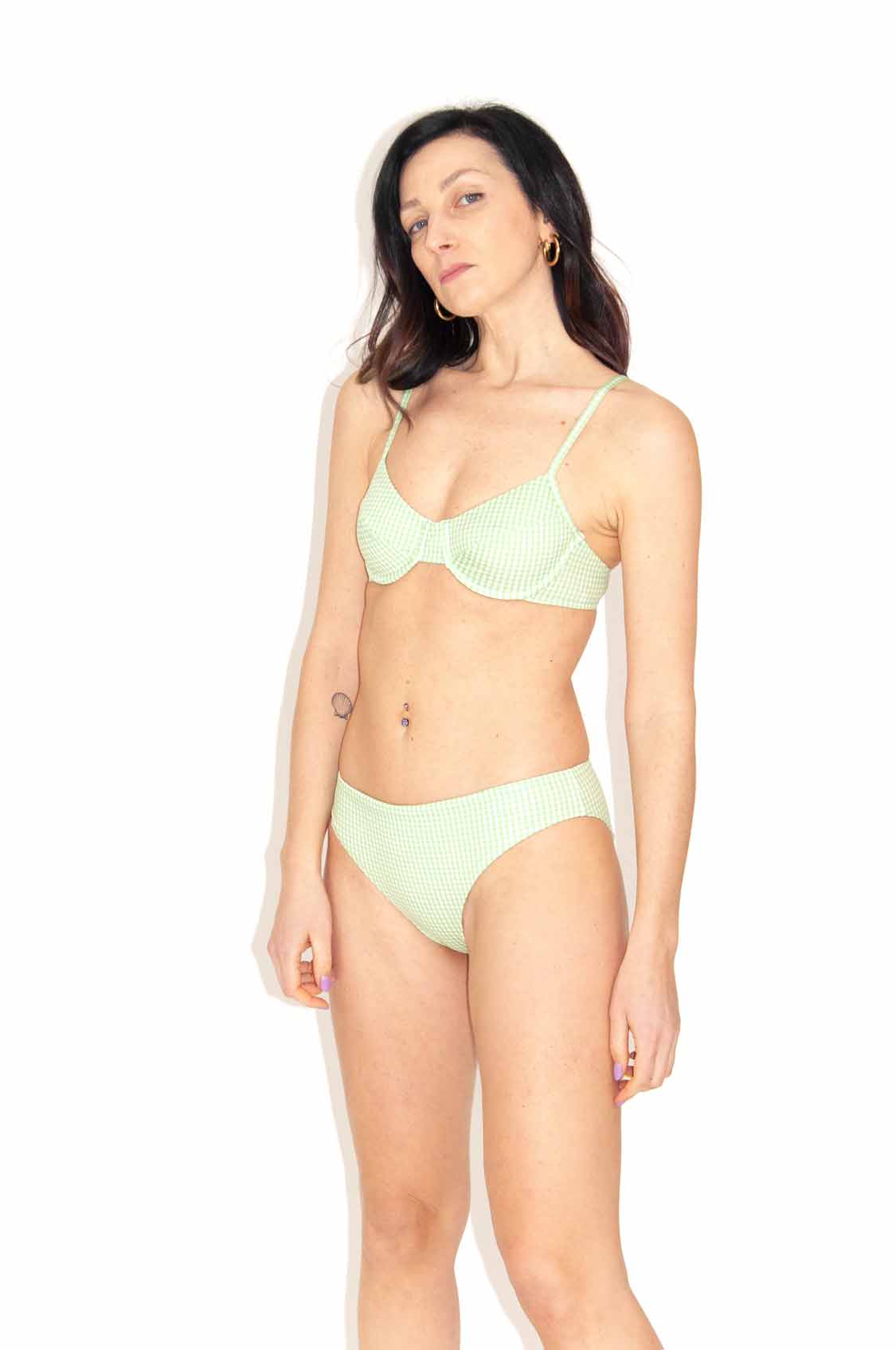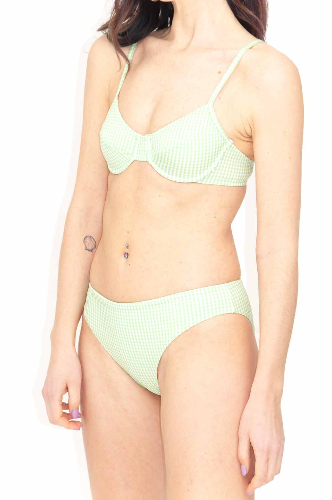 Bikini con top ferretto e slip alto in stampa vichy verde menta e bianco possibilitร di essere abbinato al pareo