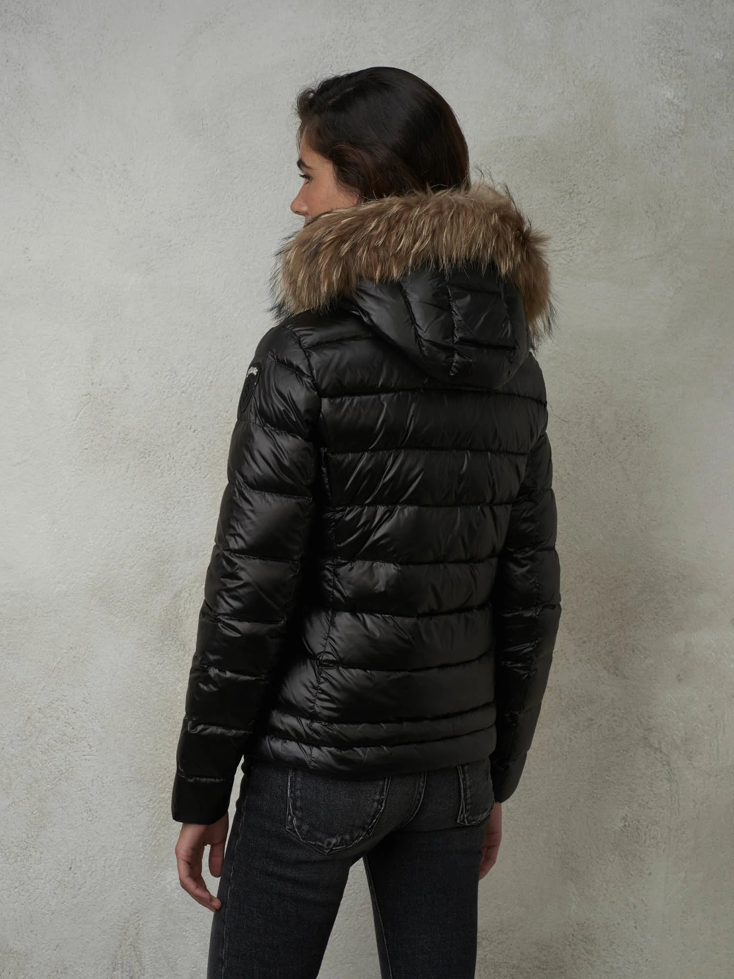 Piumino in nylon cangiante imbottito di calda piuma leggera con cappuccio fisso.Vero pelo in pelliccia removibile tramite zip.Trapuntatura orizzontale con cuciture singole.Chiusura centrale con cerniera doppio cursore, para zip interna e copri cursore sul collo.Fodera interna del cappuccio e del capo in contrasto colore.Due tasche davanti con zip obliqua e copri cursore.Profilo in fettuccia a […]