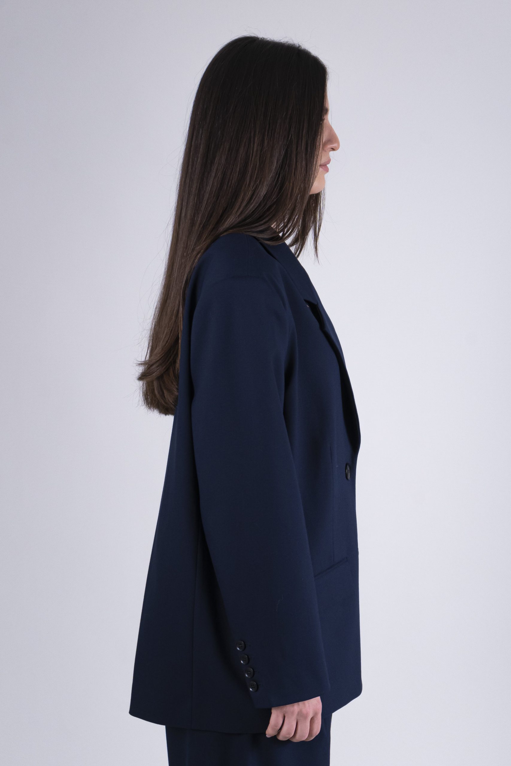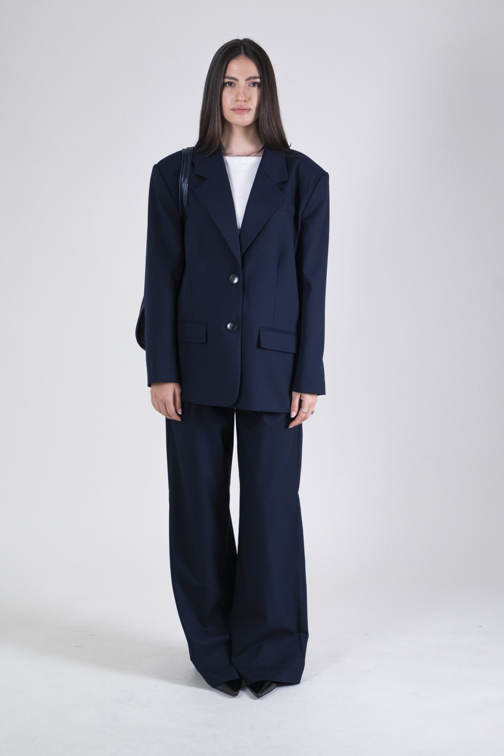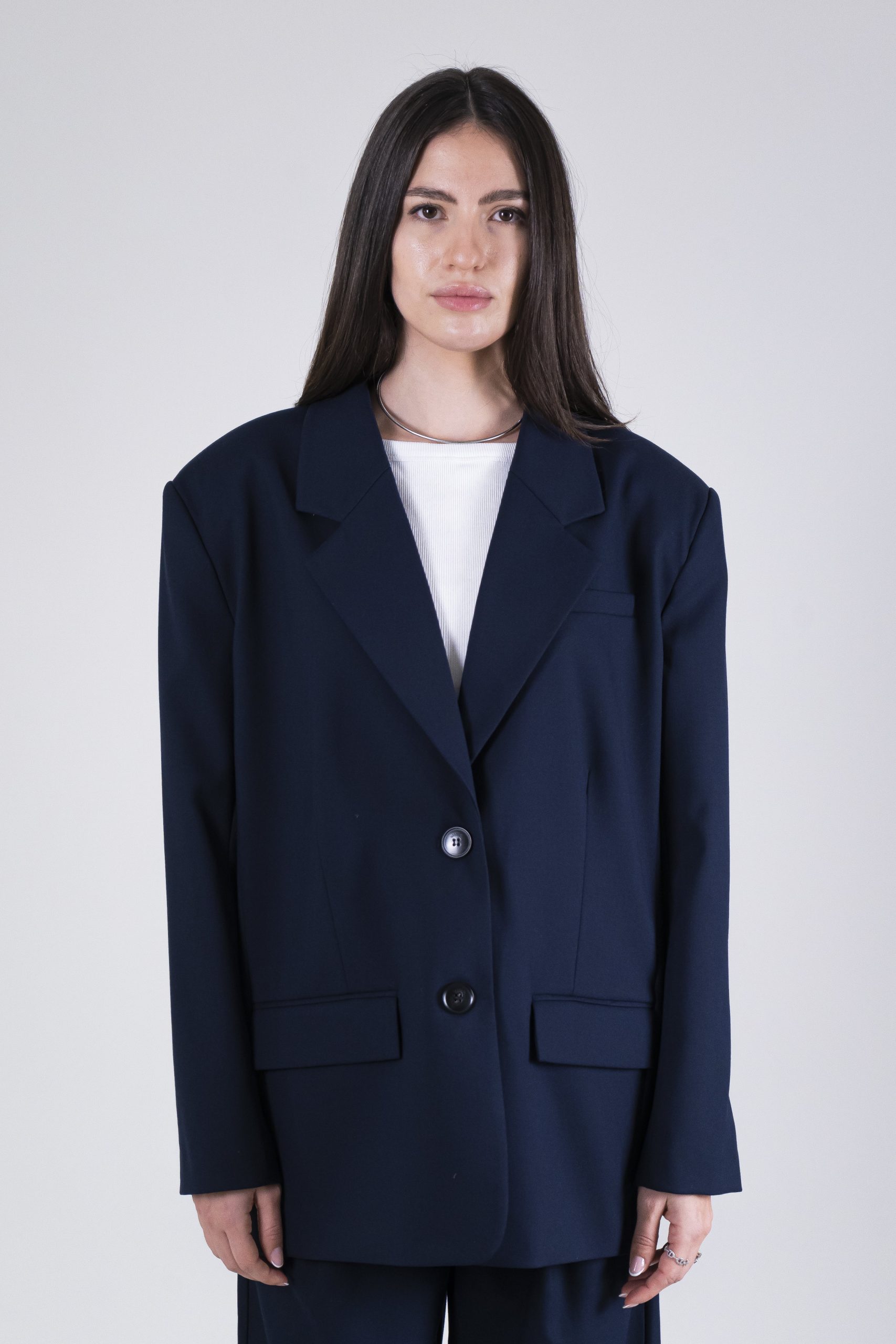 Blazer oversize con chiusura a due bottoni e revers. Il suo fit crea un look estremamente distintivo enfatizzando la figura. Realizzato nel colore di stagione “Blue Captain” per un dettaglio classico puรฒ essere abbinato al suo pantalone con pinces nello stesso tessuto e colore. 68% poliestere 30% viscosa 2% elastane