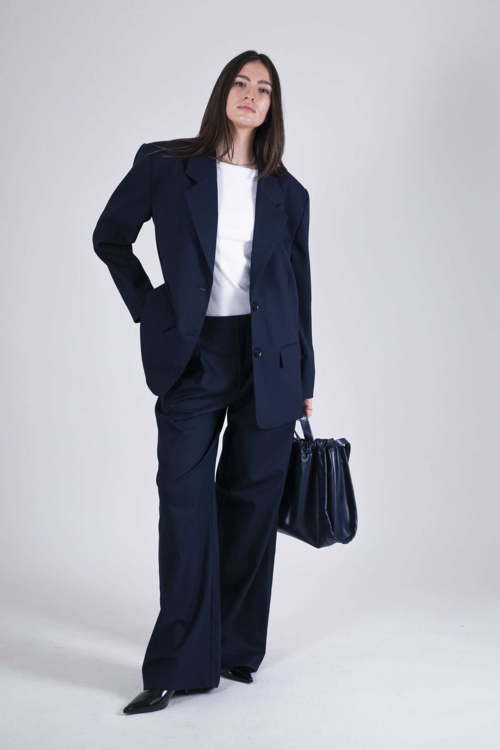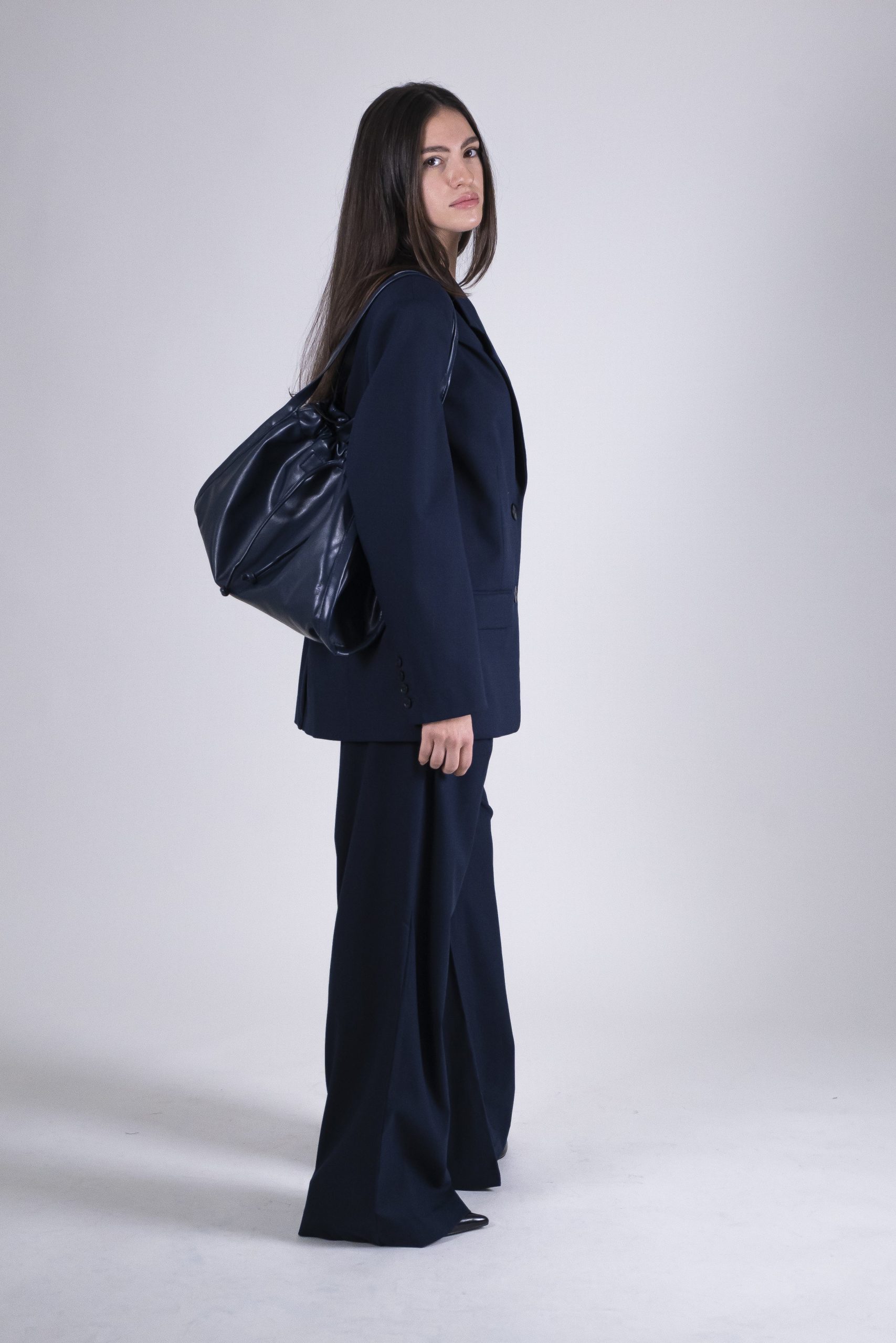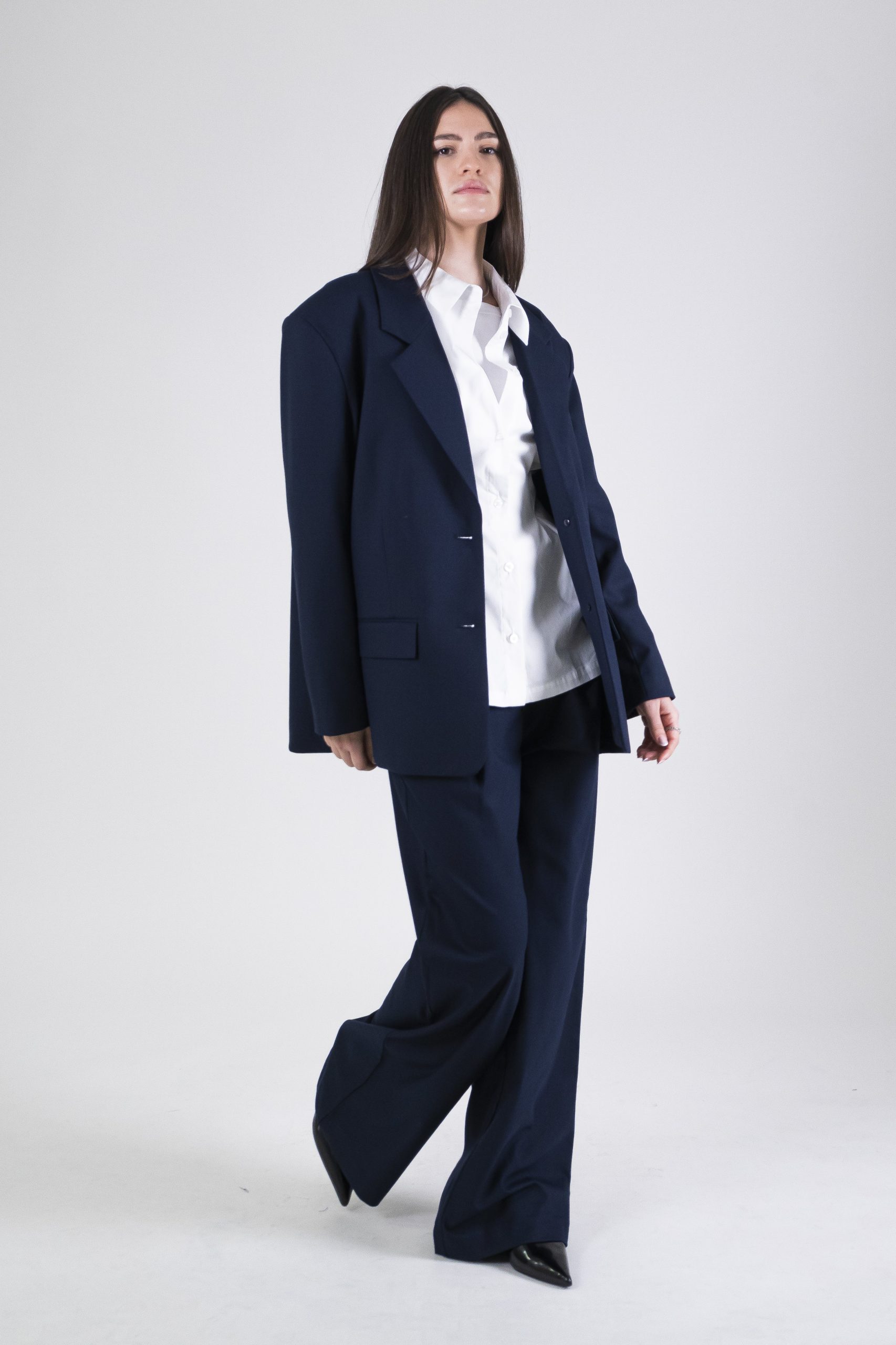 Blazer oversize con chiusura a due bottoni e revers. Il suo fit crea un look estremamente distintivo enfatizzando la figura. Realizzato nel colore di stagione “Blue Captain” per un dettaglio classico puรฒ essere abbinato al suo pantalone con pinces nello stesso tessuto e colore. 68% poliestere 30% viscosa 2% elastane