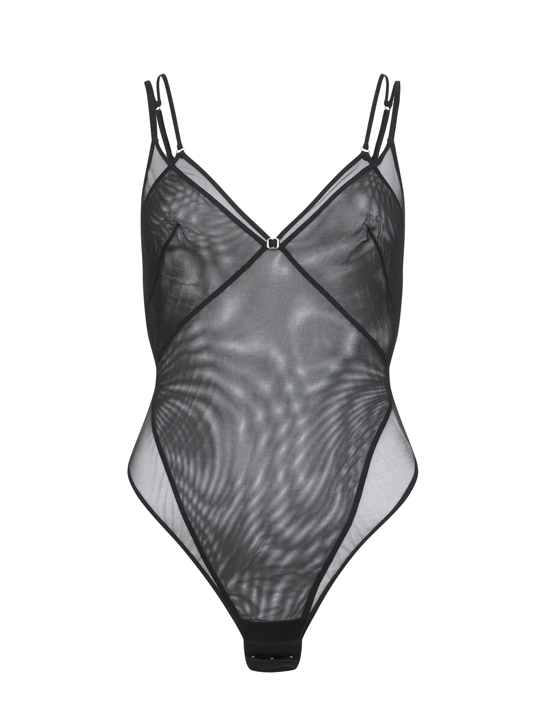 Body perizoma in tulle trasparente, leggero, con sovrapposizioni che disegnano il corpo con precisione e sensualitร . I contrasti tra chiaro e scuro creano un ritmo visivo audace ma bilanciato, esaltando le curve con eleganza e controllo. I dettagli metallici logati aggiungono un tocco luminoso e contemporaneo alla struttura essenziale.