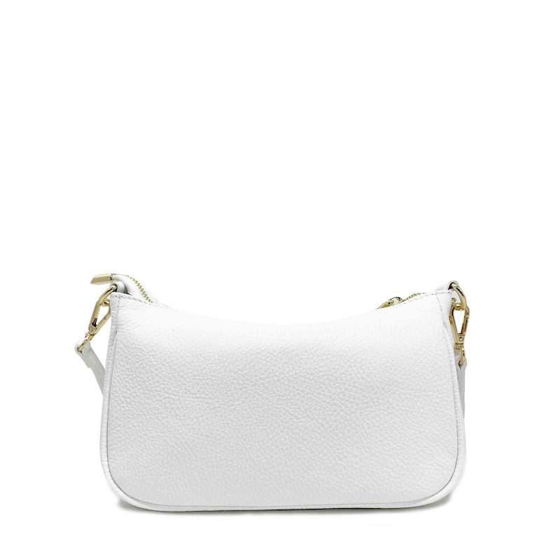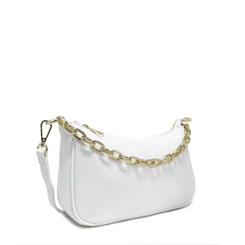 Borsa a spalla piccola da donna. Doppia tracollina removibile e regolabile. Misure 26x14x7 cm. Vera pelle 100% Made in Italy con rifiniture fatte a mano. Pendente metallico incluso con possibilitร di usarlo come portachiavi. Catena metallica decorativa frontale. Interno foderato in tessuto con singolo scomparto. Chiusura con zip centrale. Morbida, leggera e comoda, ideale per ogni occasione.