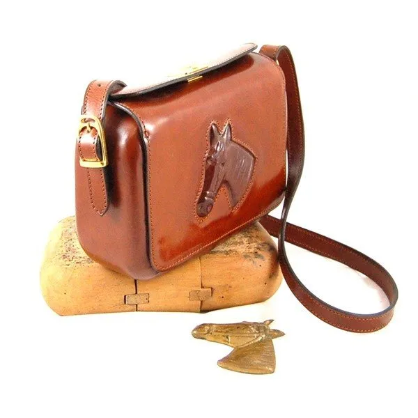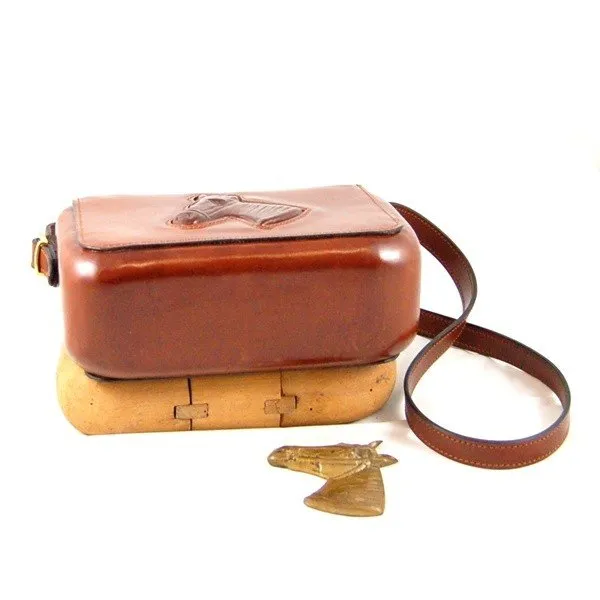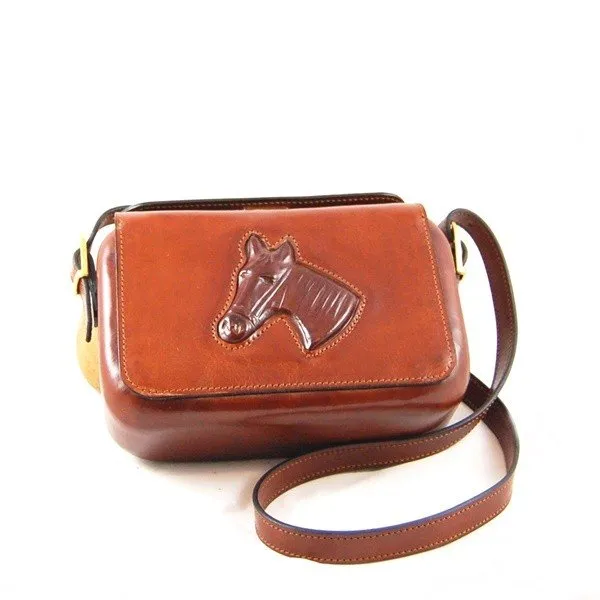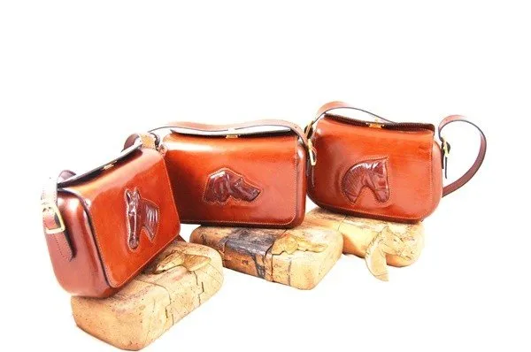 Questa creazione è un vero concentrato di unicità , la lavorazione è fatta interamente a mano il rilievo del cavallo è sagomato su una forma in ottone, il cuoio usato e’ pieno fiore conciato al vegetale, l’interno è foderato in camoscio e la tracolla con le due particolari fibbie a staffa misura complessivamente cm. 120. La forma stondata è di grande effetto.Â