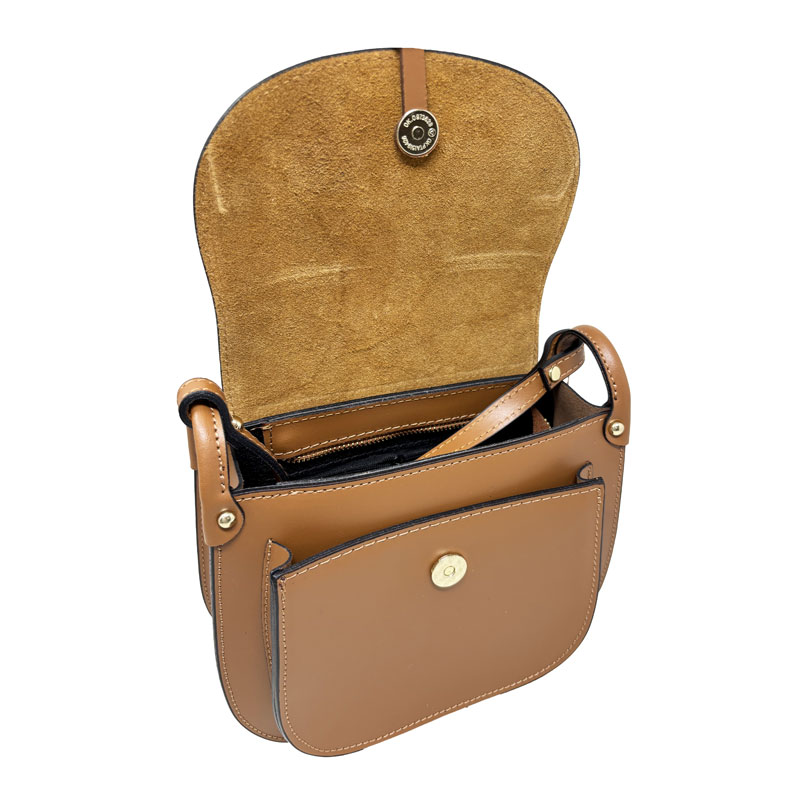 Borsa Donna a Tracolla, con pendente metallico del brand comodamente utilizzabile come portachiavi, in vera pelle 100% Made in Italy, rifiniture fatte a mano. Tracolla regolabile. Singolo scomparto interno con chiusura zip, comodo per metterci il cellulare o eventuali oggetti, chiusura con zip, uno taschino interno con chiusura zip. Una tasca frontale. Chiusura la borsa con bottone magnetico. La borsa verrà spedita all’interno di una scatola speciale cosi da evitare possibili danni durante il trasporto, è compresa anche una sacca anti-polvere morbida per preservarne la qualità.