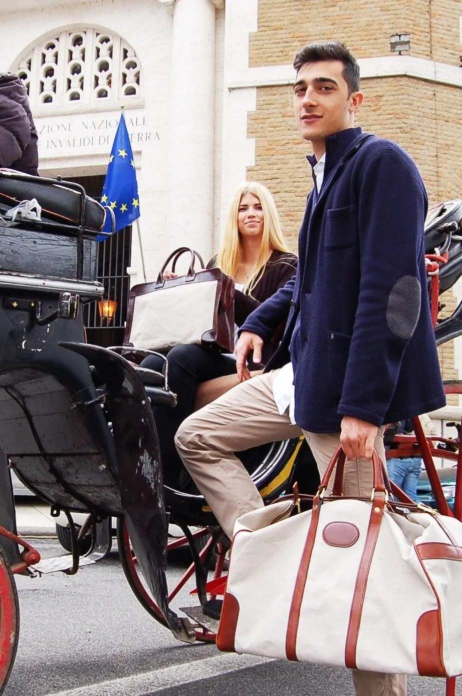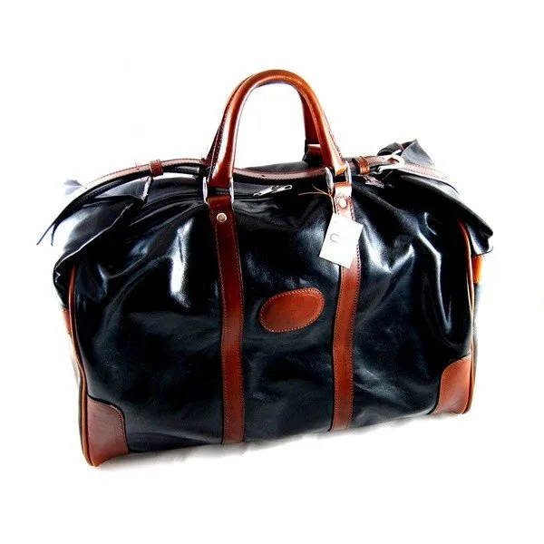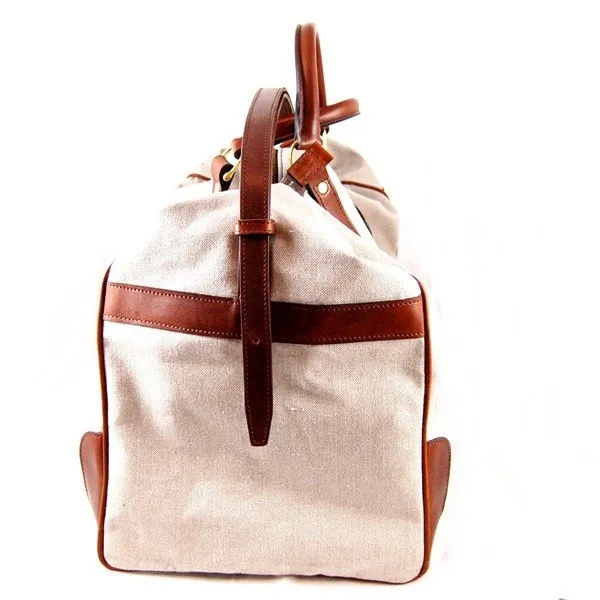 Elegante e comoda sacca da viaggio in tessuto pesante canvas, profili e rifiniture in cuoio conciato al vegetale Ideale per viaggi e weekend lunghi misure compatibili per bagaglio a mano. Possibilitร di inserire nel tondino centrale nomi ed inziali a fuoco.