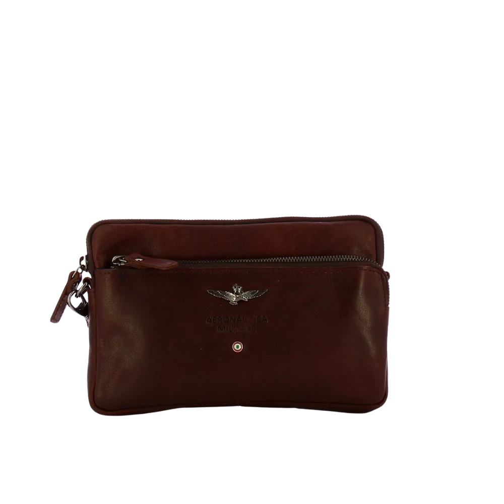 Pochette in pelle con tracolla Aeronautica Militare, funzionale e versatile accessorio in vera pelle, con polsiera e tracolla regolabile e removibile. Tasca frontale esterna e comparto principale con zip. Materiale: Pelle