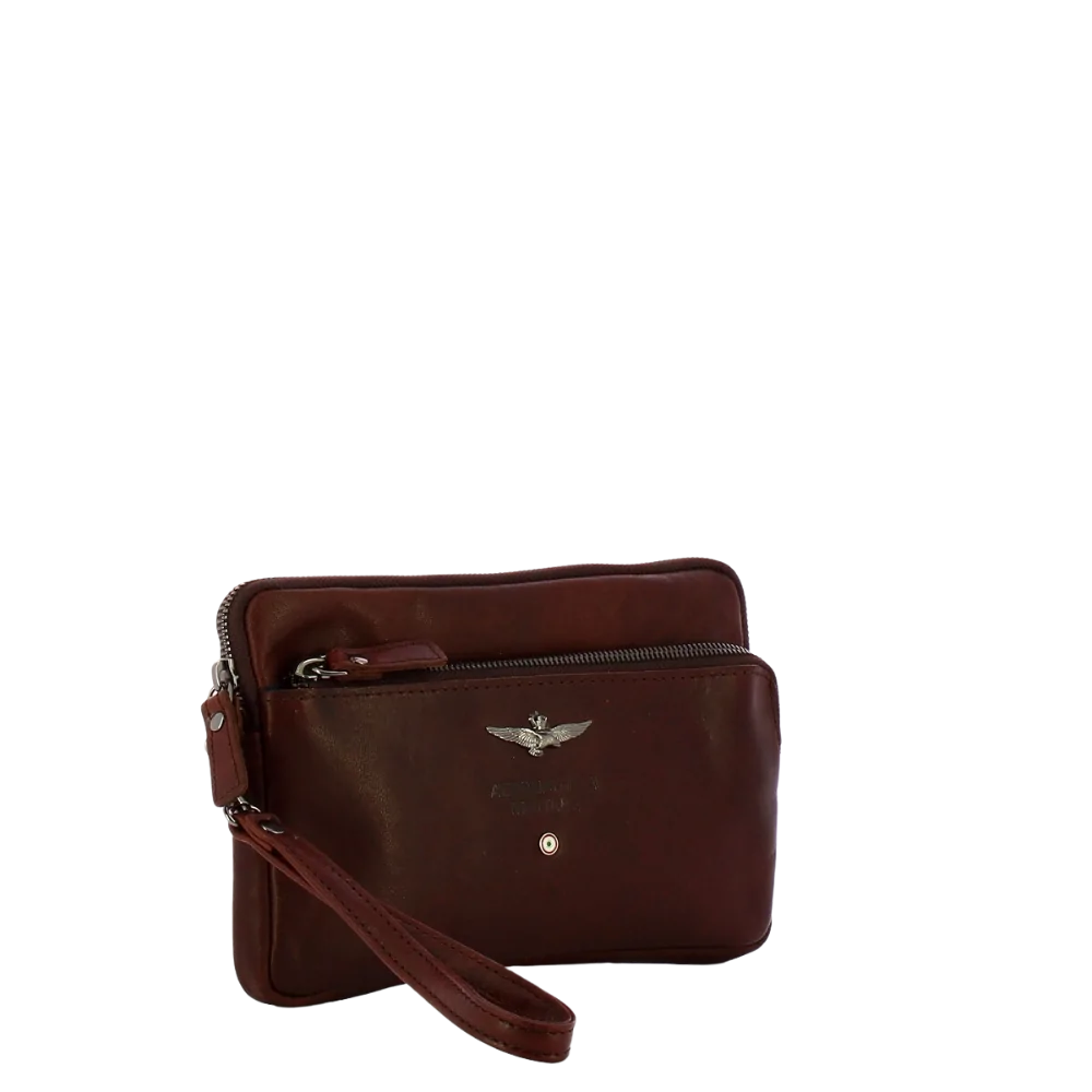 Pochette in pelle con tracolla Aeronautica Militare, funzionale e versatile accessorio in vera pelle, con polsiera e tracolla regolabile e removibile. Tasca frontale esterna e comparto principale con zip.