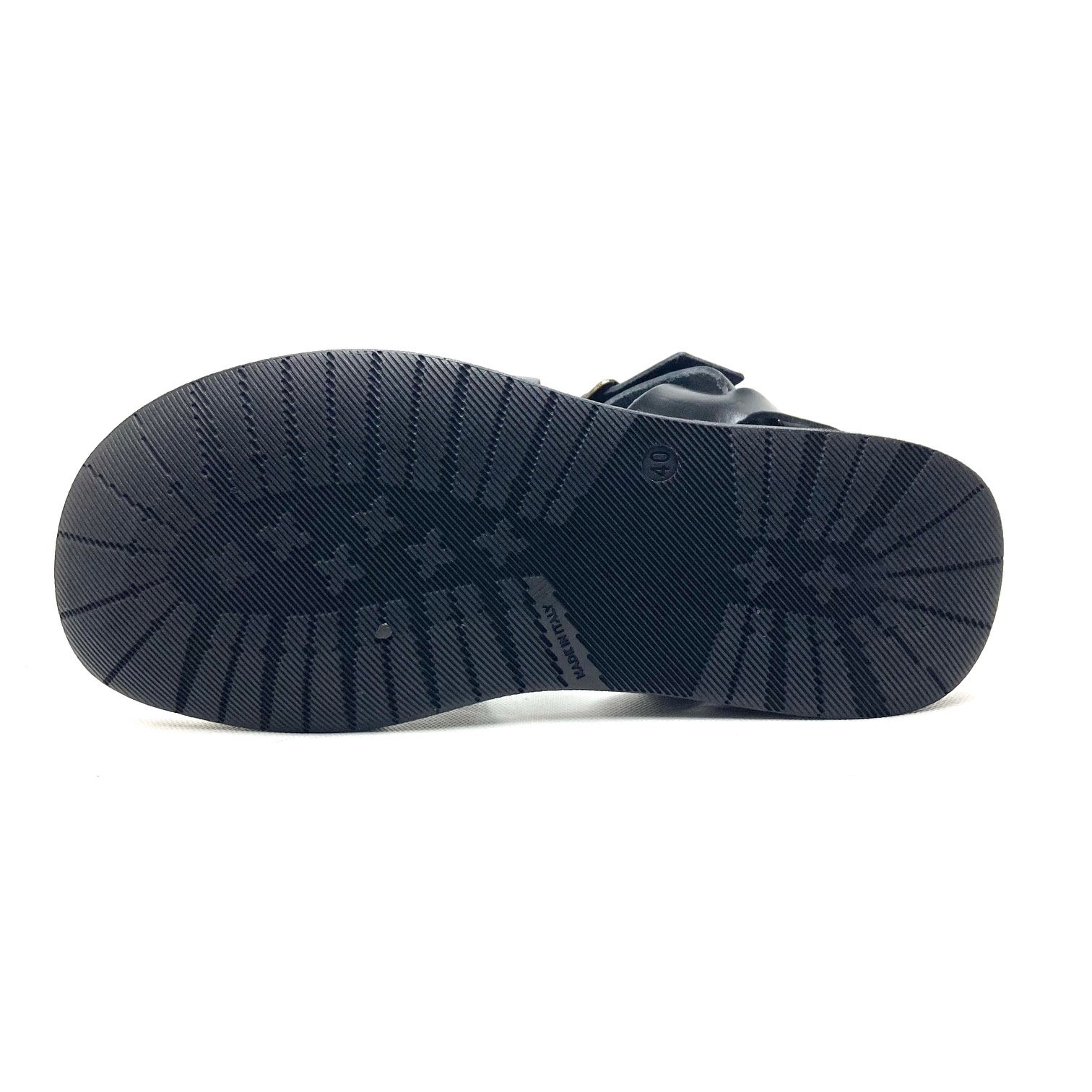 Sandalo in pelle tinto capo nera allacciato con fibbia, plantare anatomico in cuoio lavato flessibile. Suola in gomma, 100% Made in Italy