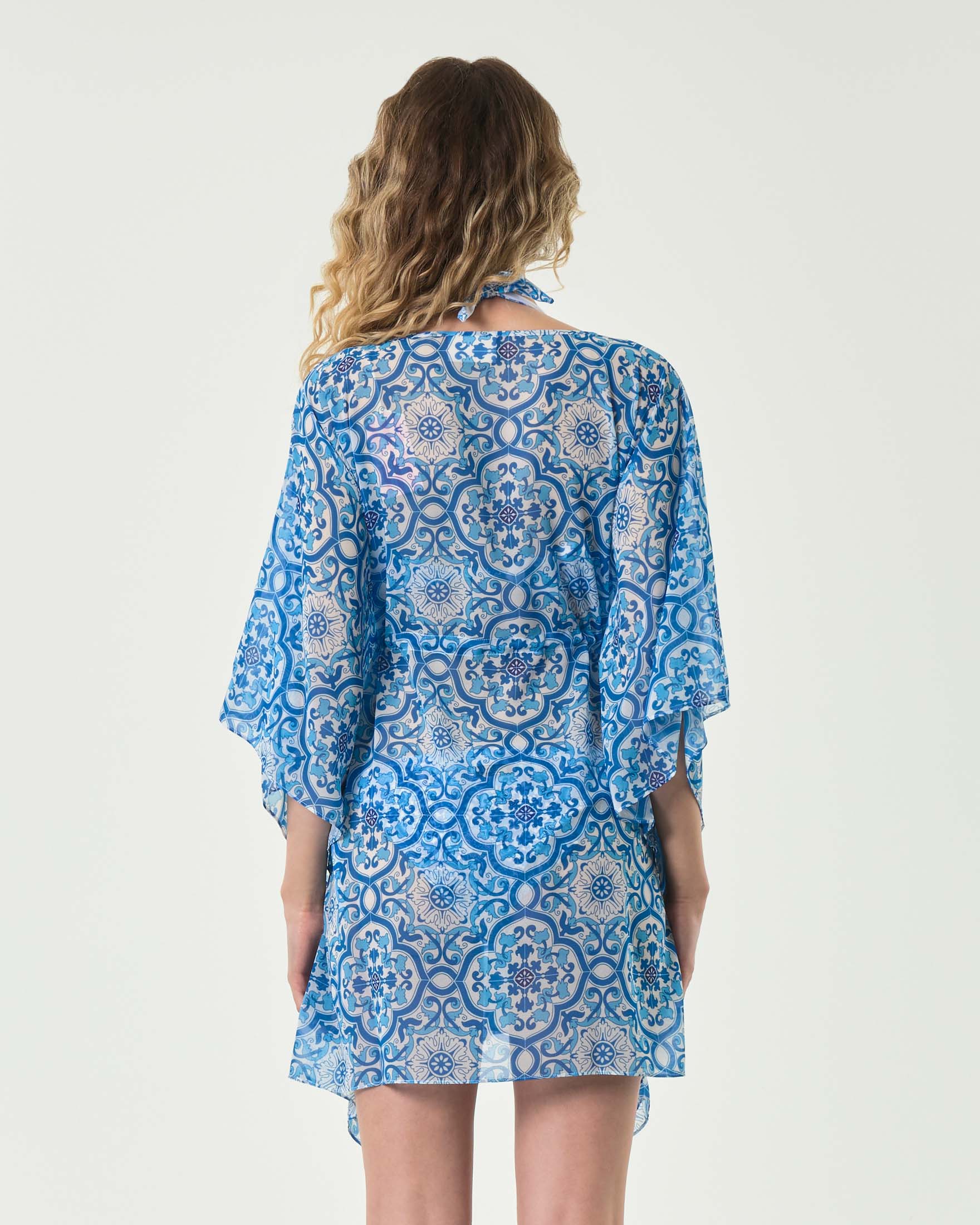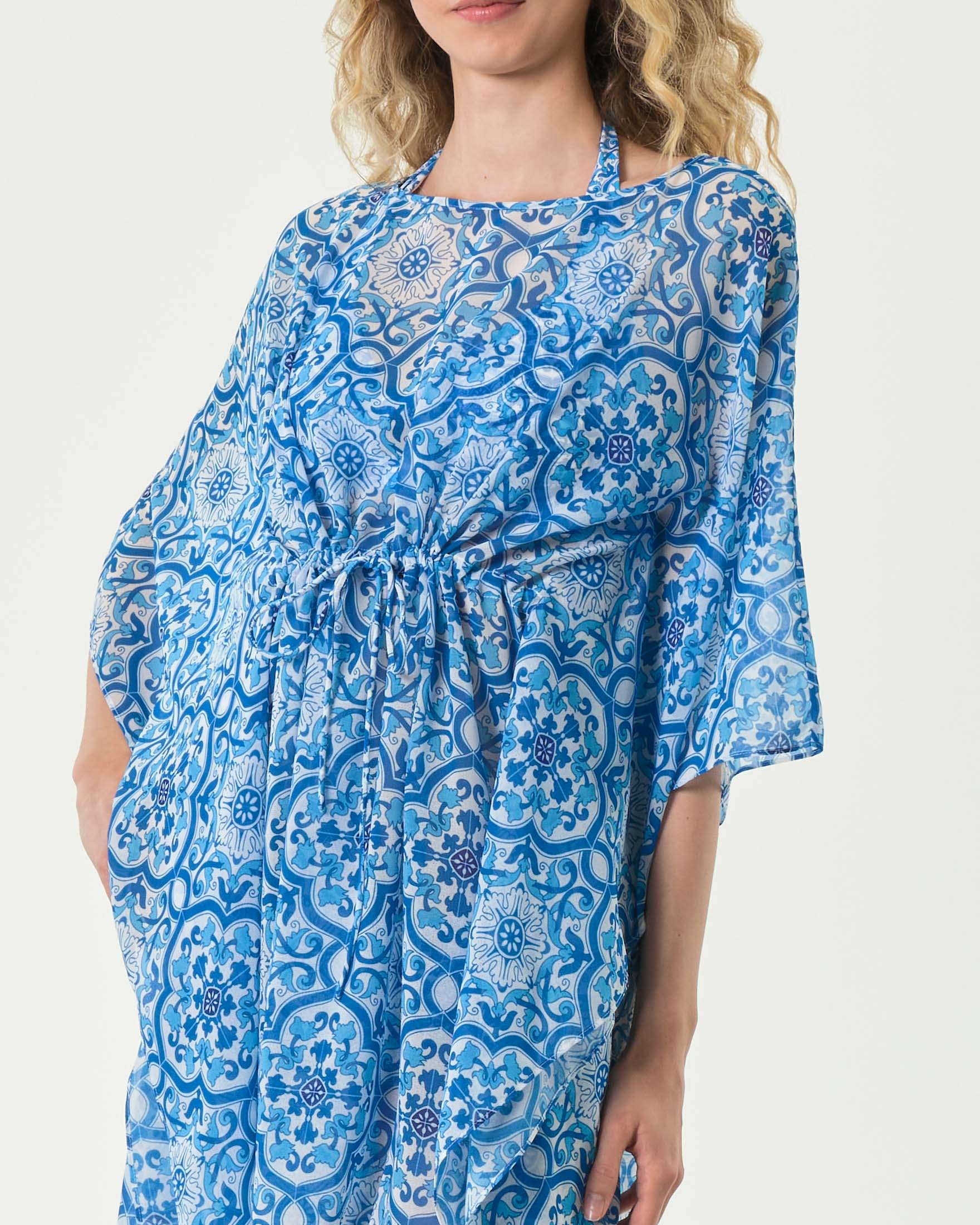Caftano MC2 Saint Barth azzurro a fantasia maiolica con coulisse in vita