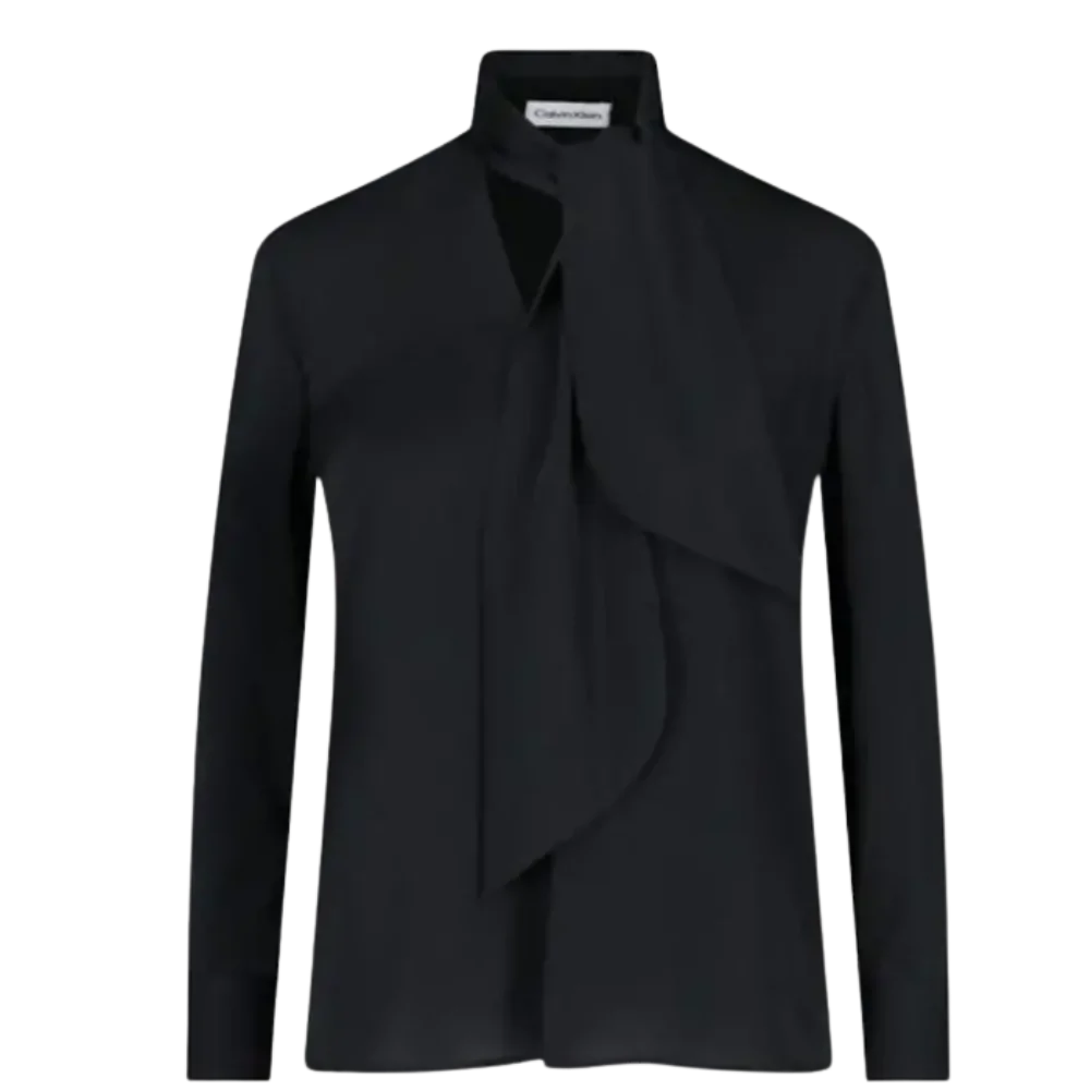 CAMICIA LAVALLIรRE CALVIN KLEIN, IN TESSUTO NERO, COLLO ALTO, FIOCCO REGOLABILE ANTERIORE, BOTTONI POLSINI, TARGHETTA LOGO SU FONDO, ORLO DRITTO.