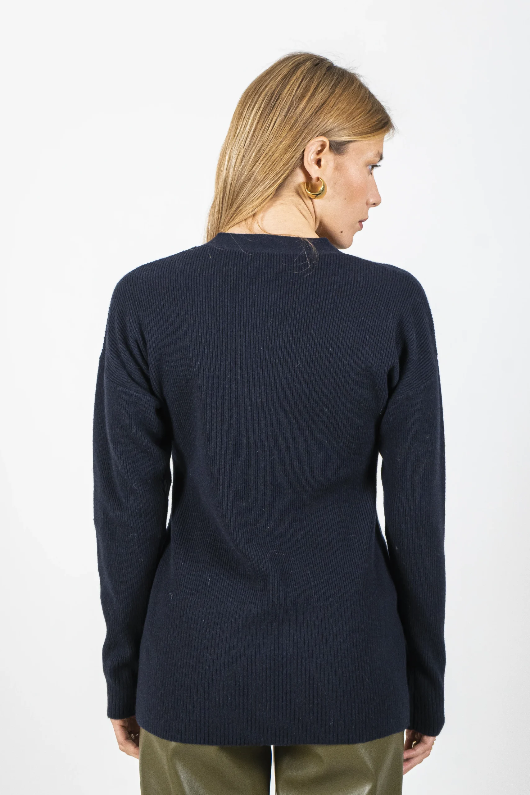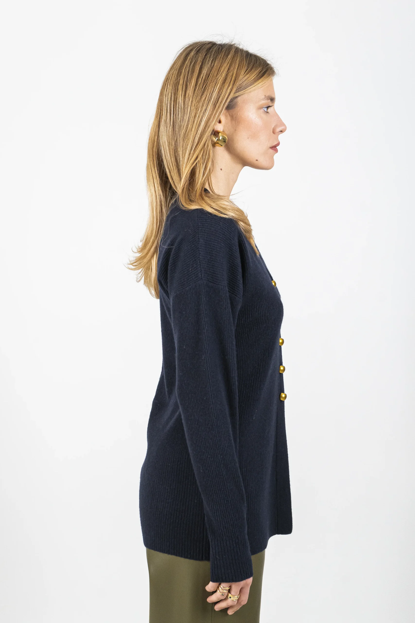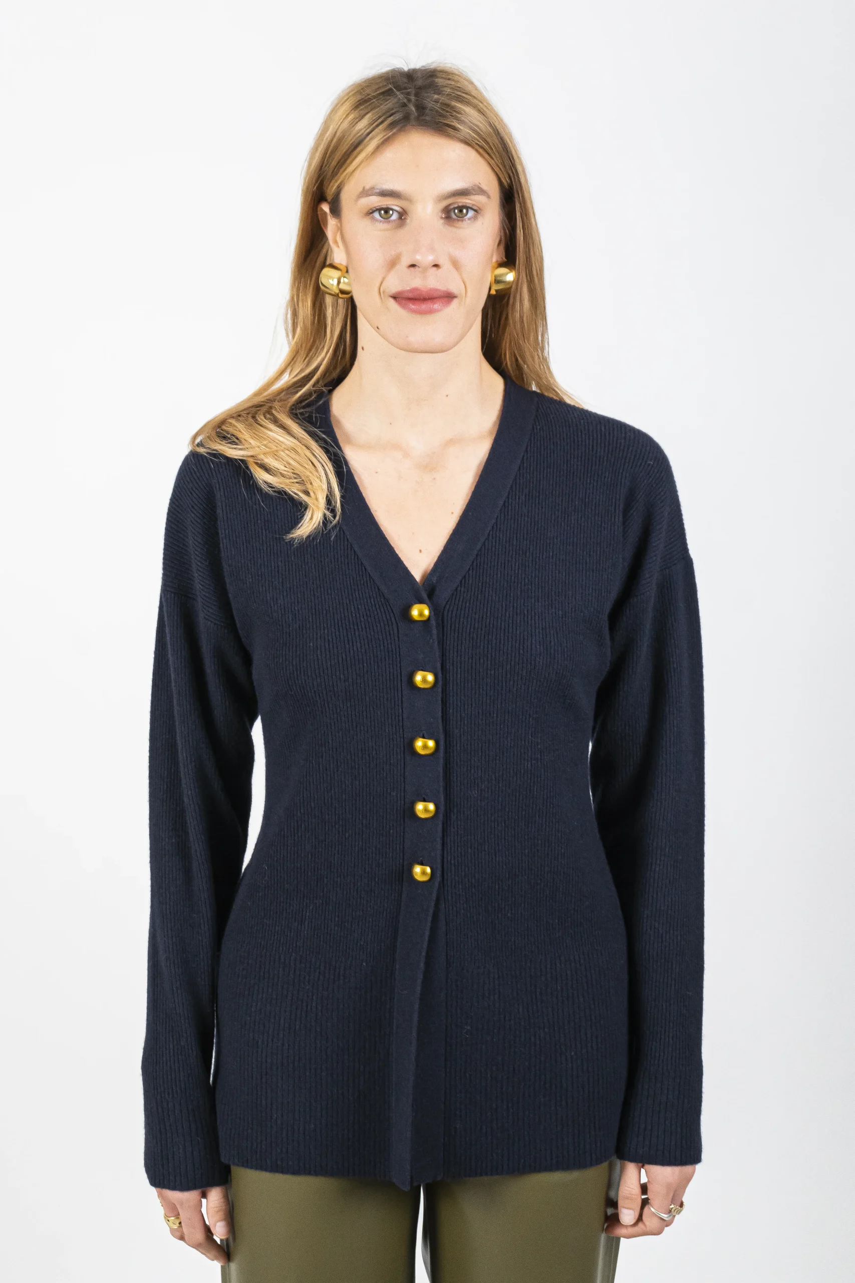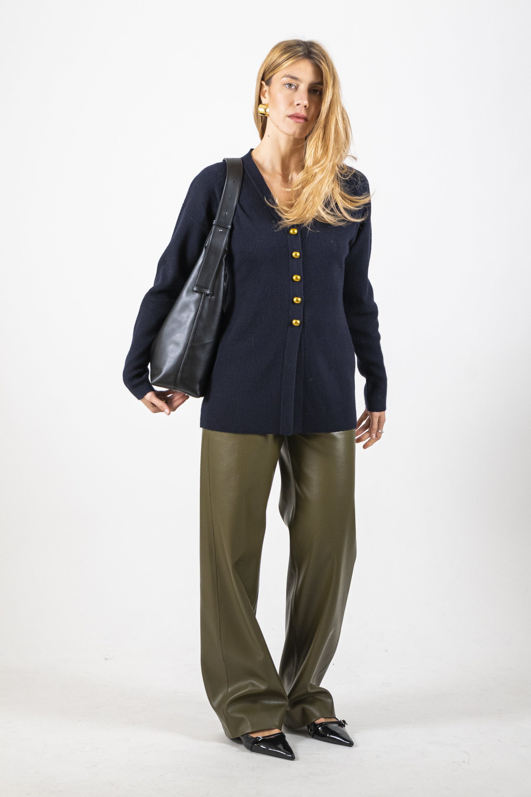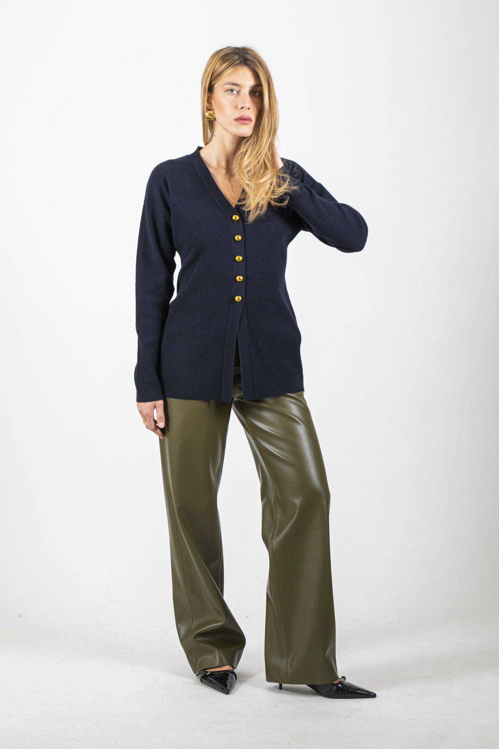 Questo cardigan รจ un modello sagomato, a costa sottile, con manica balloon e bottoni oro satinati. Portabile come una giacca รจ davvero una maglia calda e raffinata. Blush l’ha abbinata a contrasto con un pantalone in ecopelle verde oliva dal taglio dritto e deciso. Bellissimo anche indossato con una camicia bianca. 50% lana 50% poliammide