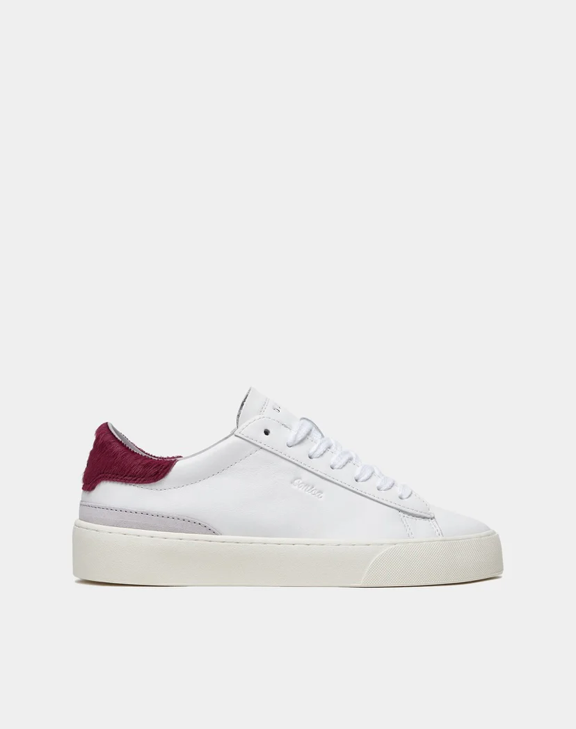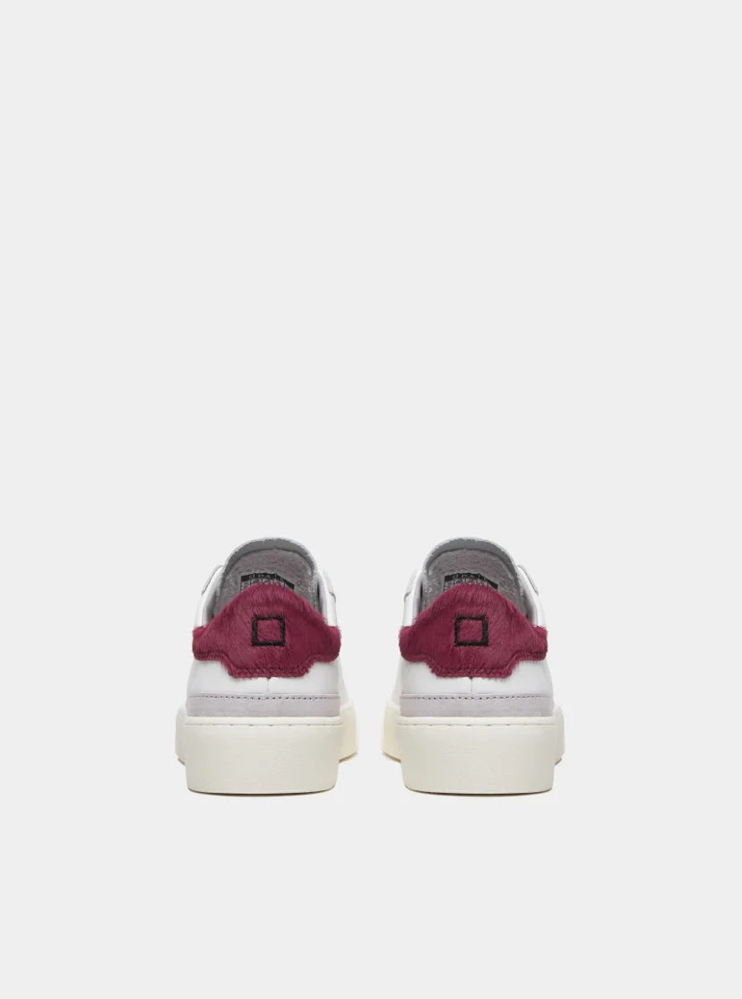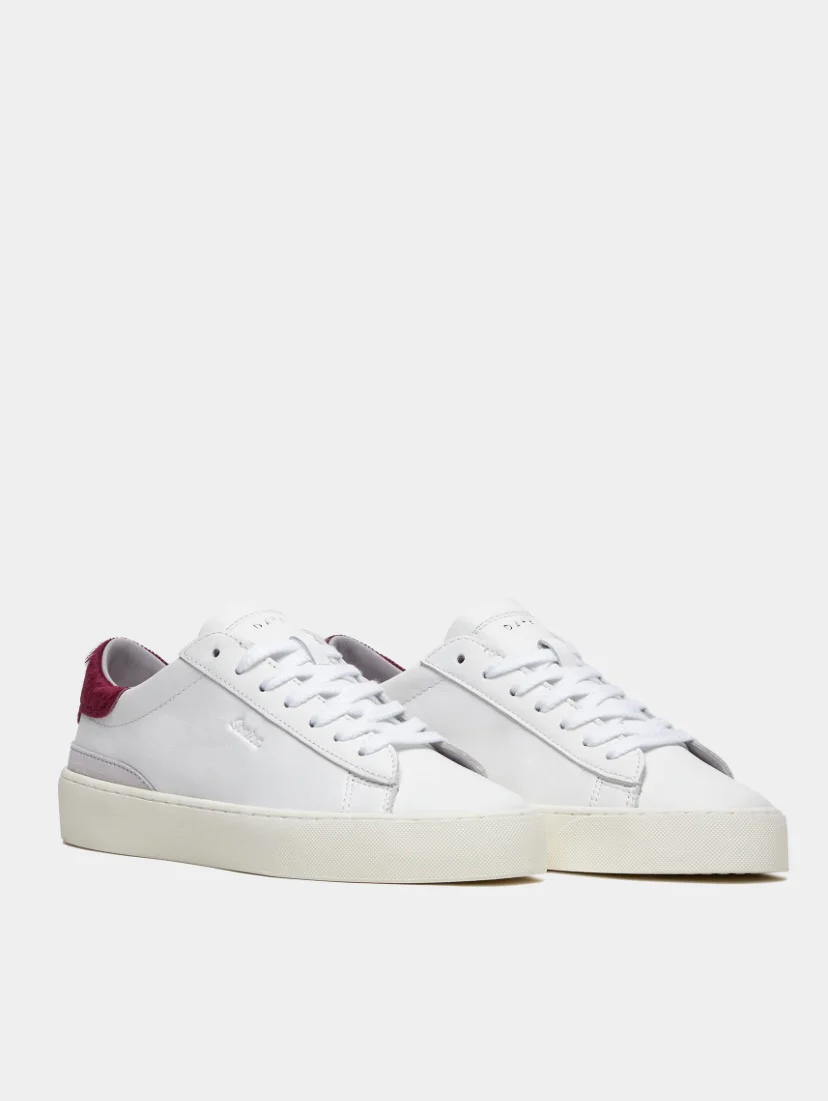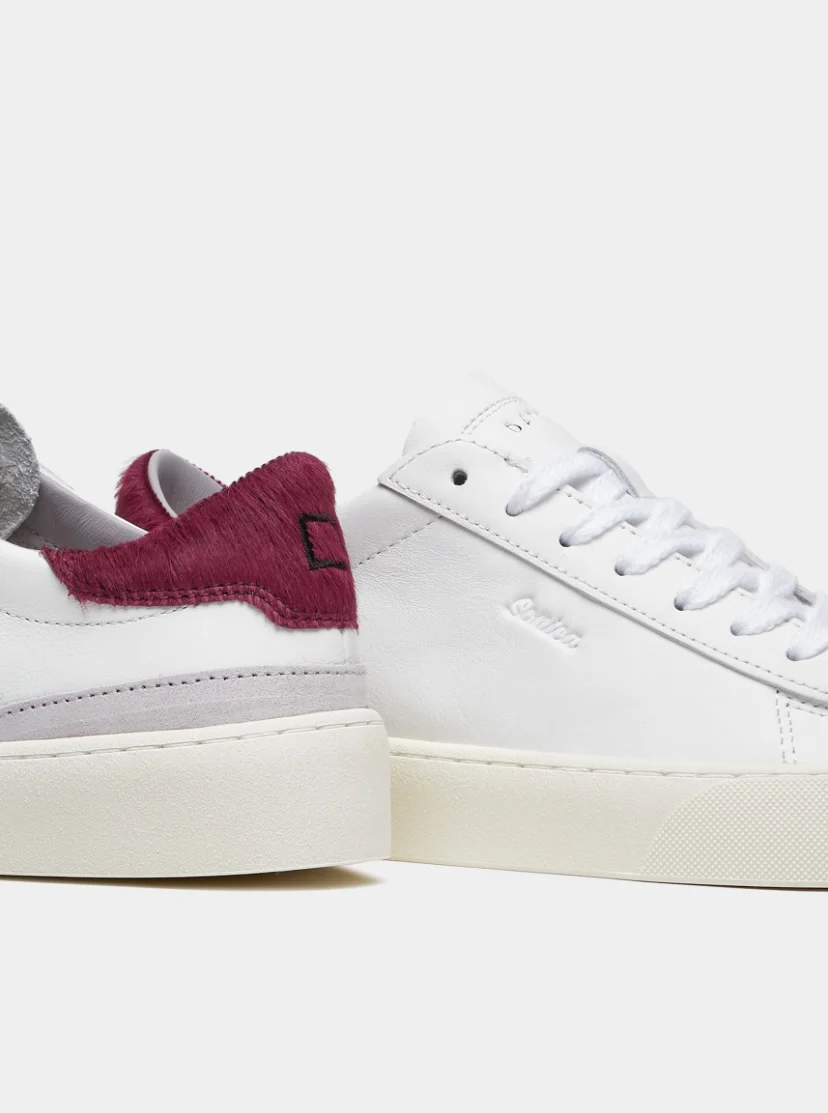 Sneakers Sonica di D.A.T.E., realizzate in morbida pelle di colore bianco, con inserti di camoscio in nuance. Dettaglio tallone in vacchetta di colore prugna . Interno in morbida spugna di cotone. Applicazione del marchio impresso a caldo sul lato esterno. Morbidi lacci di cotone bianco. Plantare in pelle estraibile di 2 centimetri. Fondo a cassetta di gomma di colore bianco.