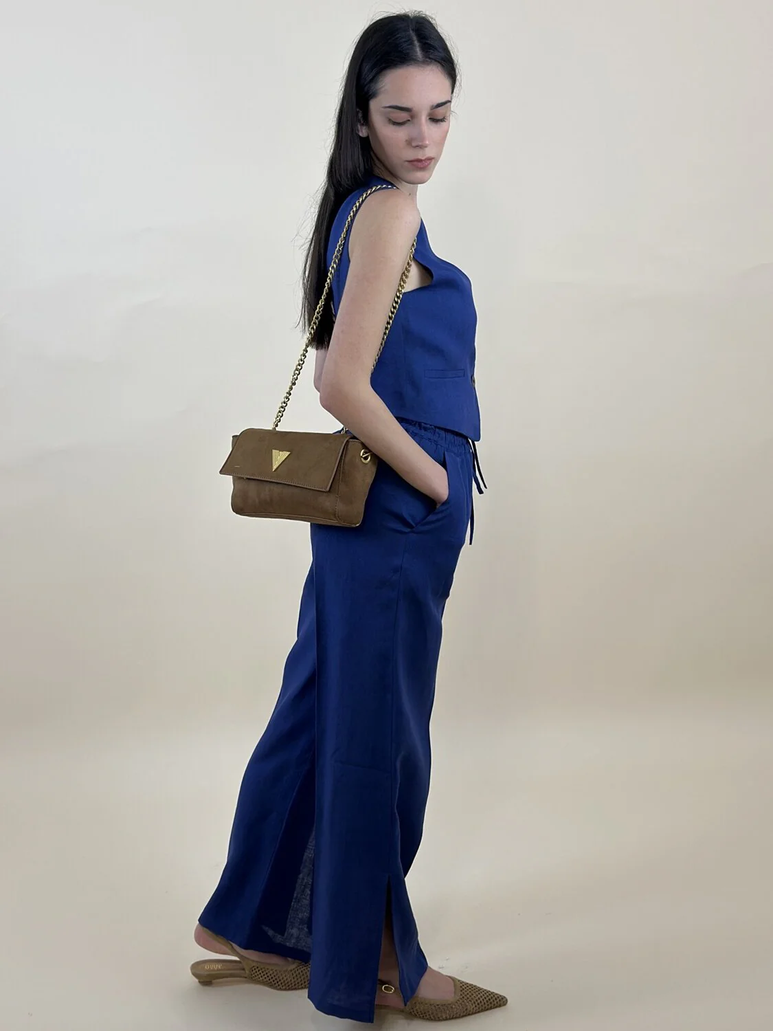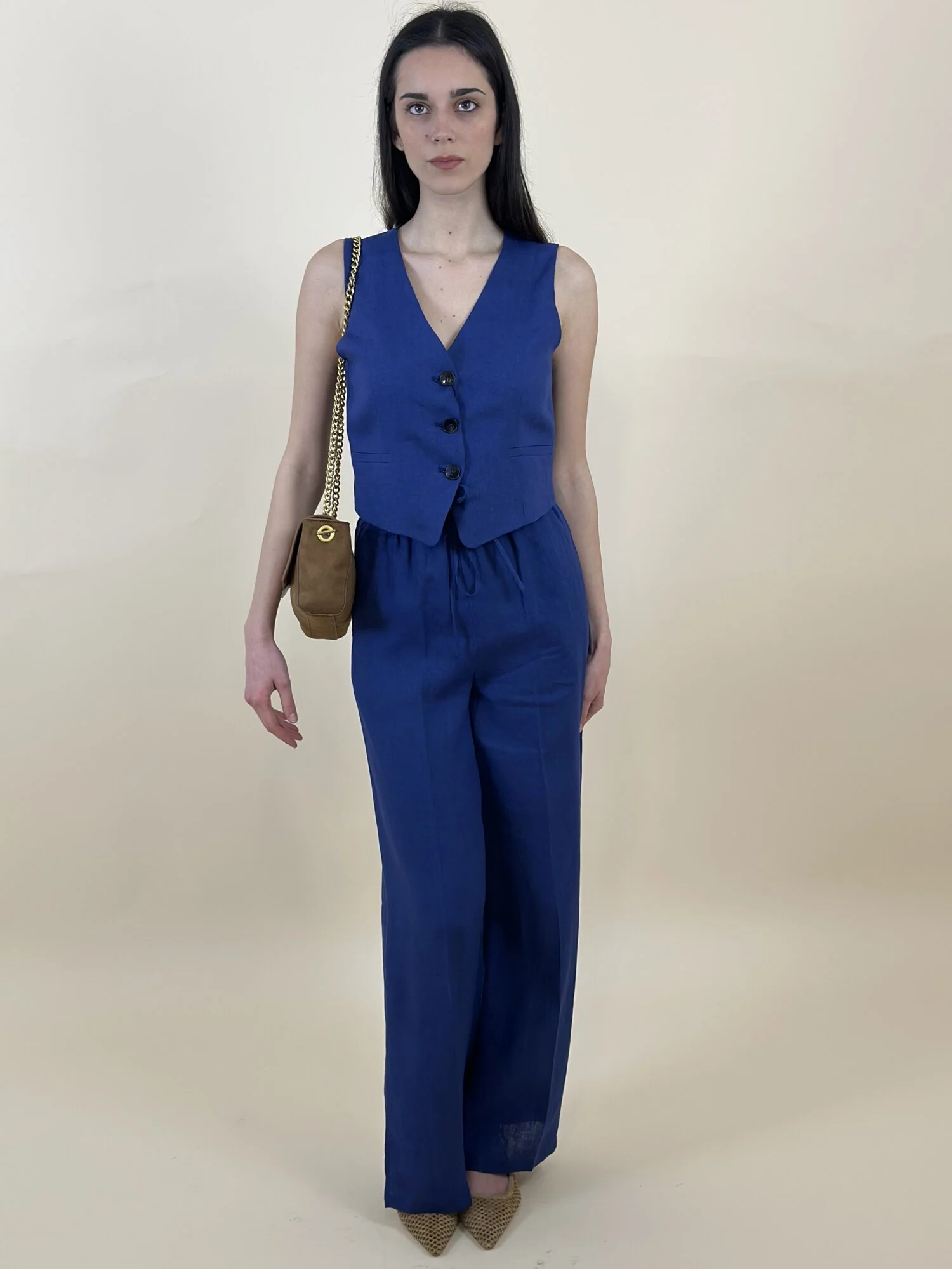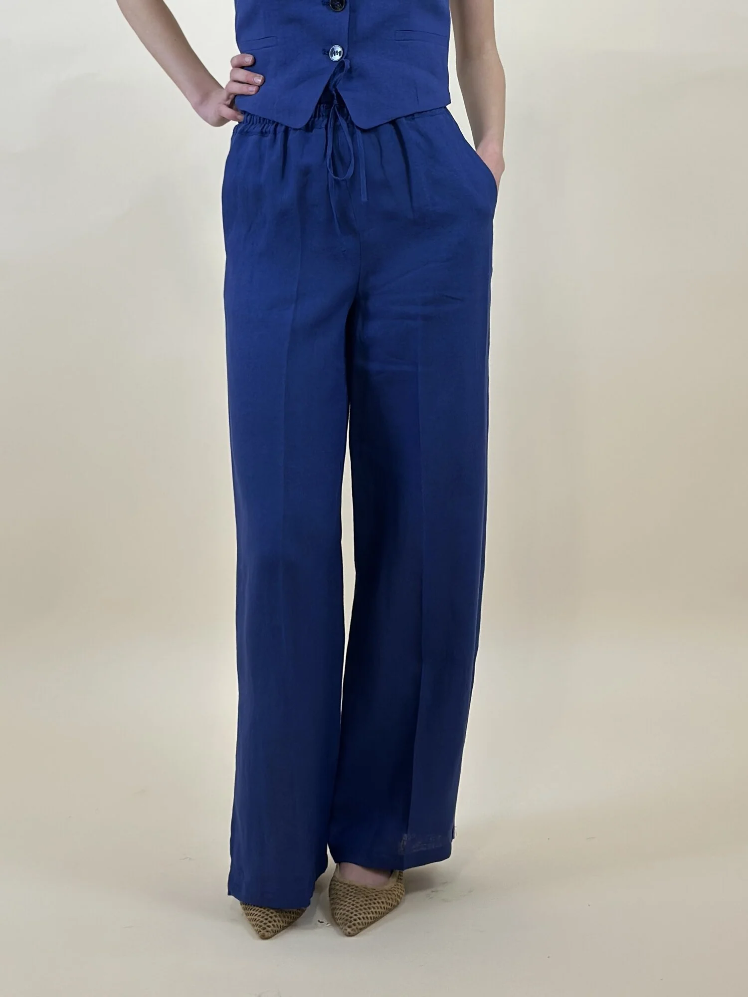 Pantalone in tela di puro lino. Fit ampio. Inserto elastico in vita con coulisse. Piega stirata davanti e dietro. Tasche laterali alla francese. Spacchi laterali sul fondo.