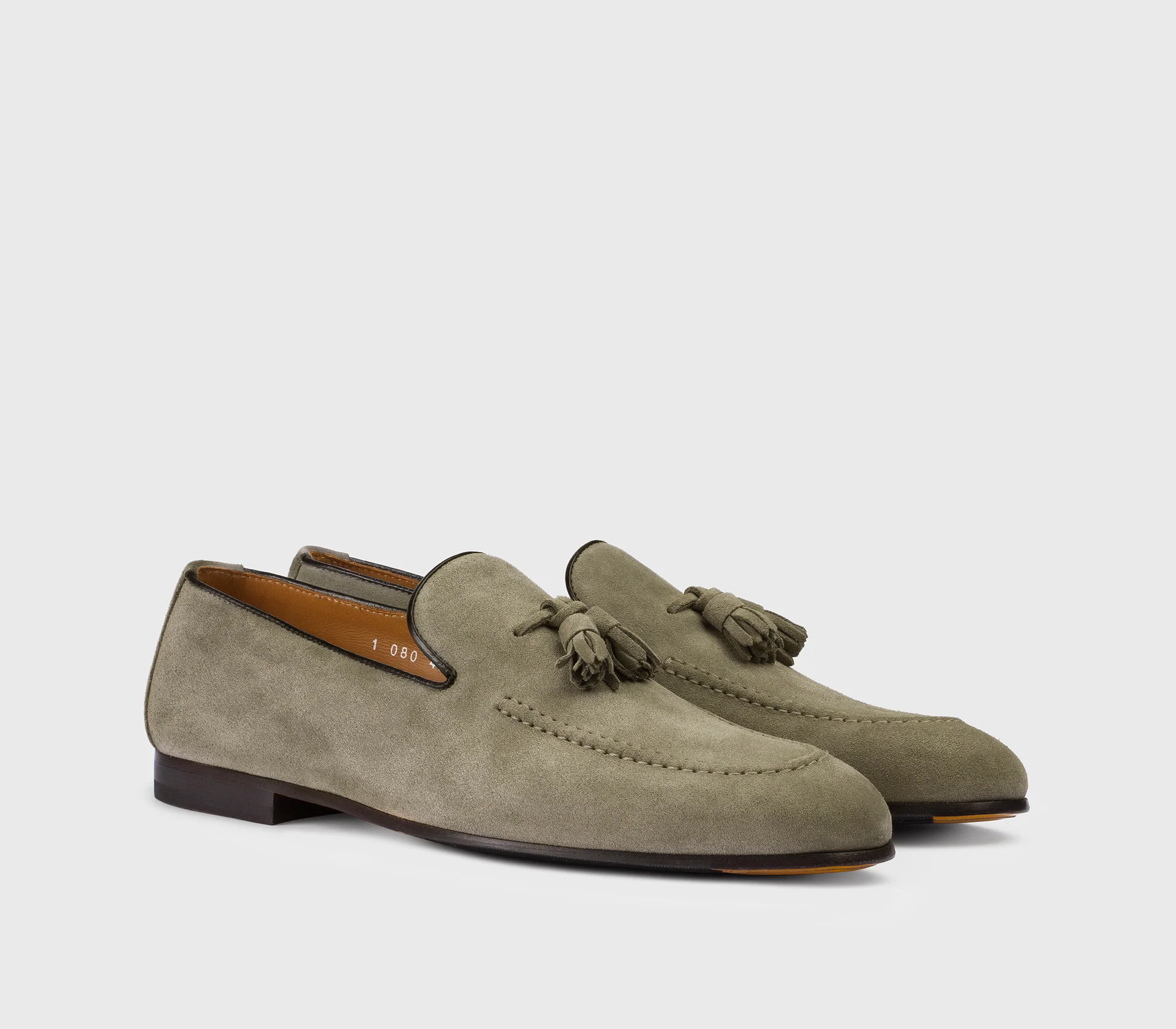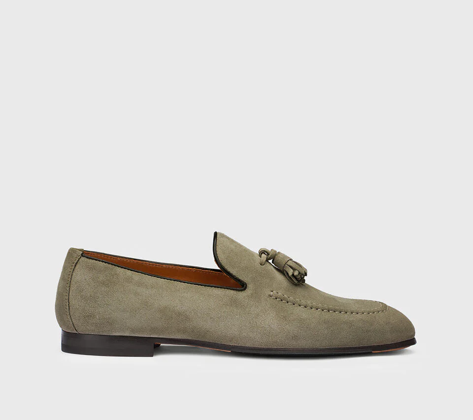 Mocassino in suede nut, con nappine tono su tono. Espressione massima della maestria artigianale con accurata raffinatezza. Costruzione a sacchetto e cucitura a vaschetta. La lavorazione Blake rende la scarpa resistente e morbida nella calzata, suola in cuoio nell’iconico giallo Golden Cream con mezza piantina in gomma.