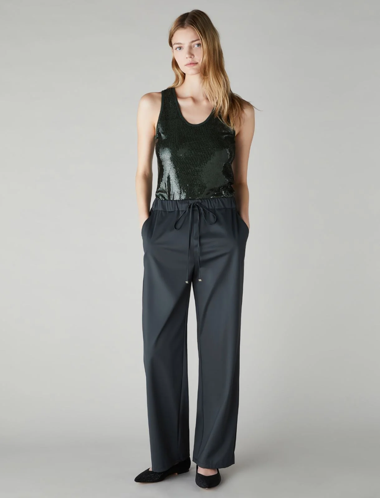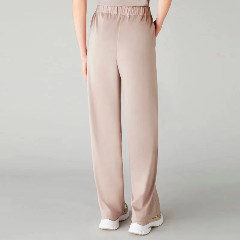 Easy and chic, i pantaloni in jersey stretch offrono uno stile rilassato ma femminile, perfetto per i momenti piรน casual. Il volume ampio sulla gamba e la coulisse offrono tutto il comfort di cui hai bisogno Pantaloni in jersey tecnico stretch Linea wide leg Elastico in vita con coulisse Tasche alla francese sui fianchi