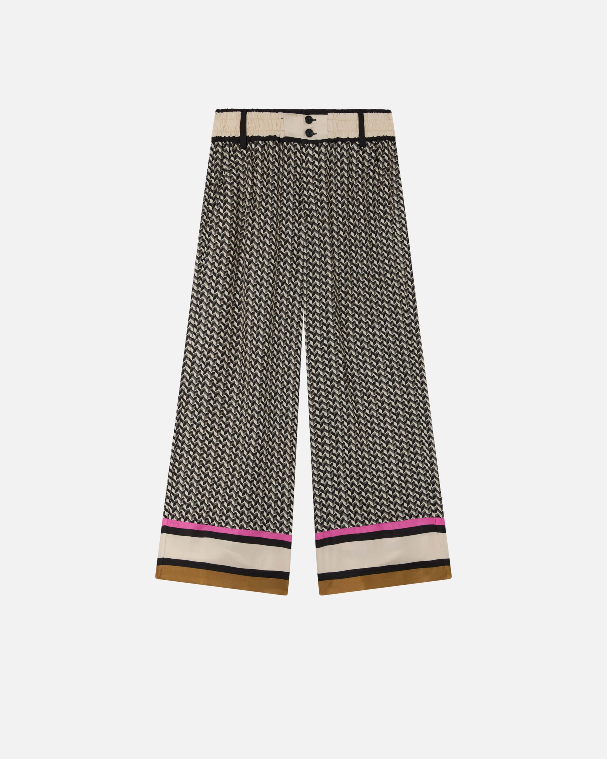 Pantaloni lunghi da donna in leggero tessuto twill di viscosa caratterizzati da una particolare stampa foulard all-over e dettaglio a righe color block a fondo capo. Linea morbida, con vita alta completata da inserto elastico e passanti per cintura e tasche sui fianchi, Chiusura con zip e doppio bottone.