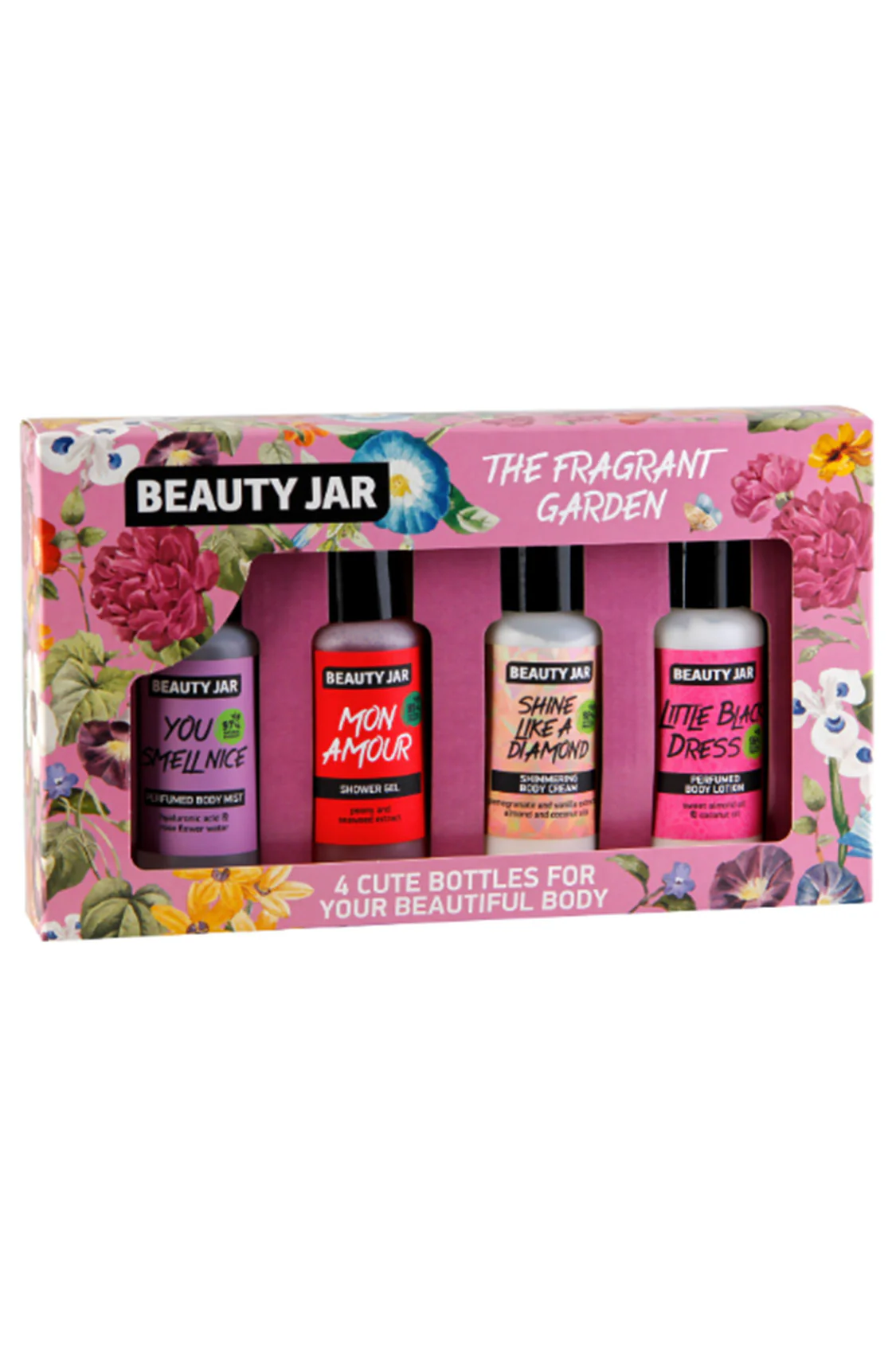 The frangrance garden set comprende 4 prodotti corpo: 1 body mist acqua spray delicata che lascia una deliziosa scia di profumo con acido ialuronica 80 ml + gel doccia profumato con estratti di peonia e alghe marine 80 ml + crema corpo scintillante con estratti di m,elogranbo e vaniglia 80 ml + crema corpo con olio di cocco e mandorle dolci 80 ml