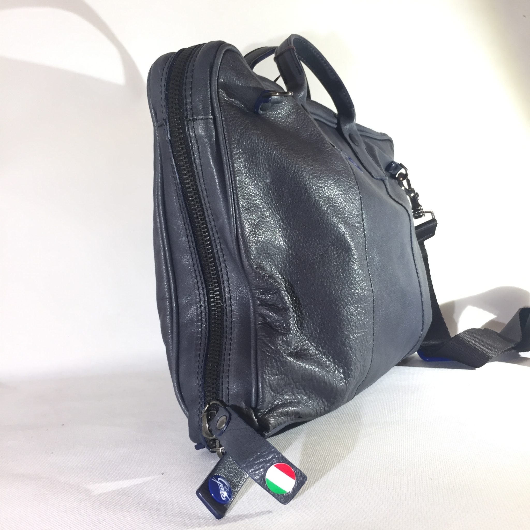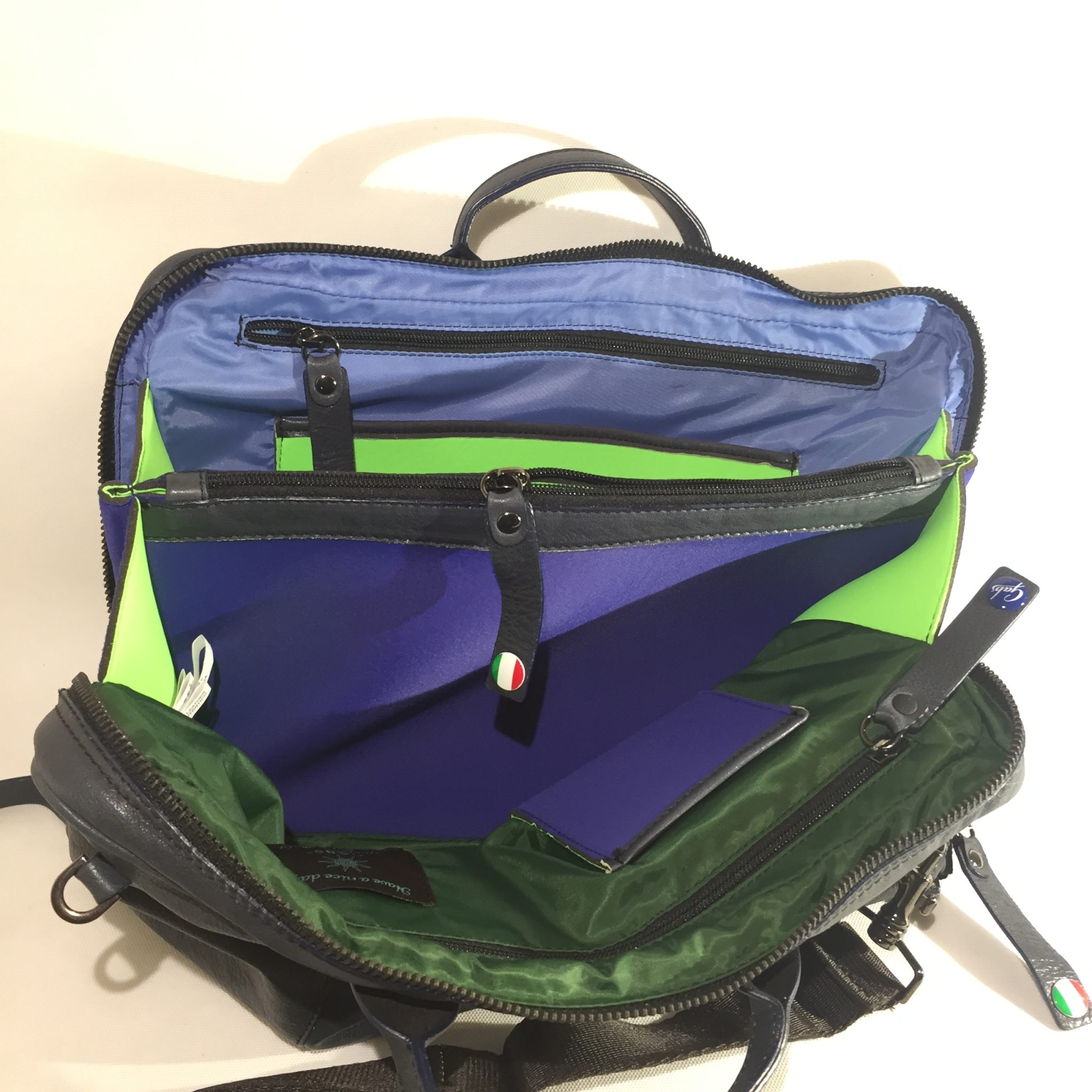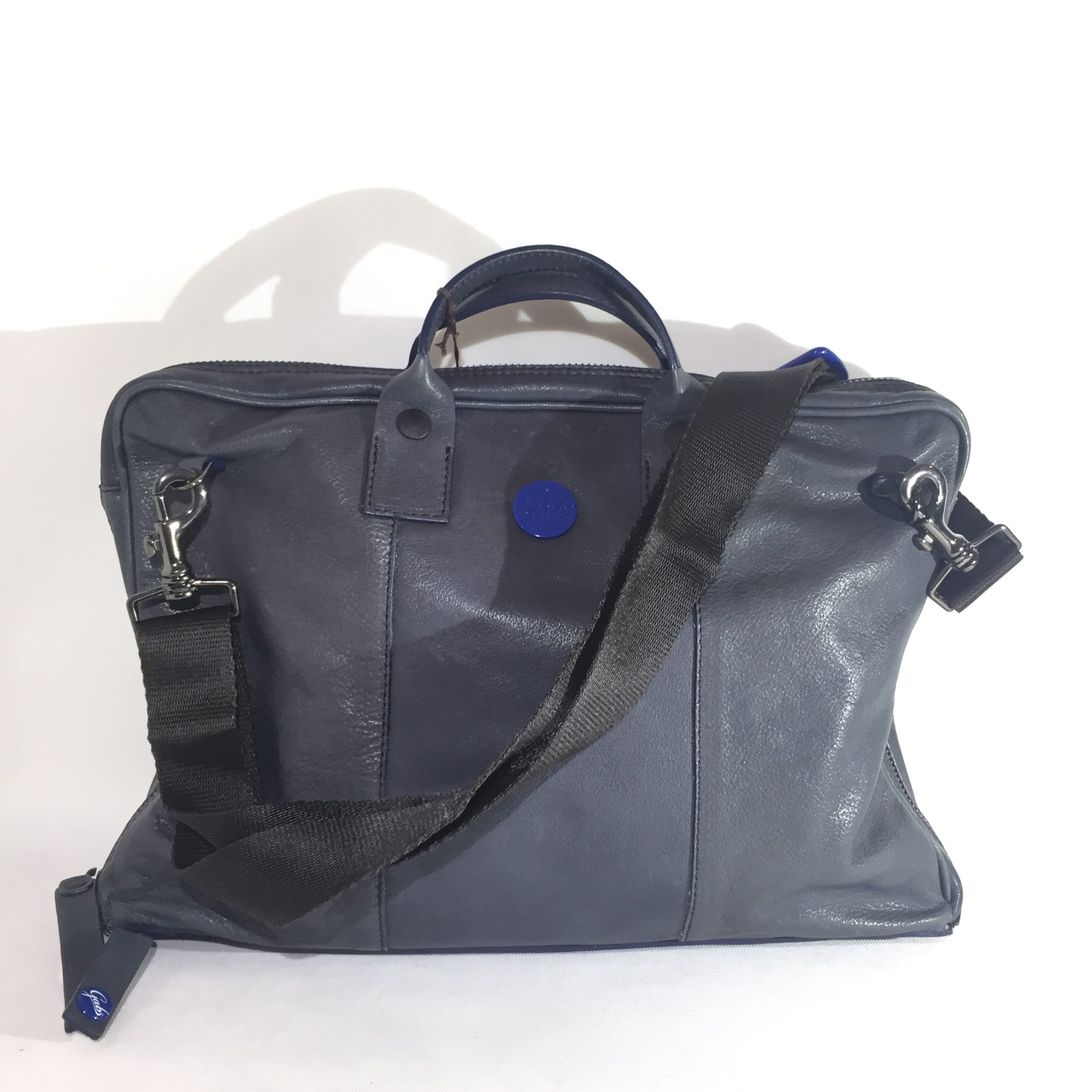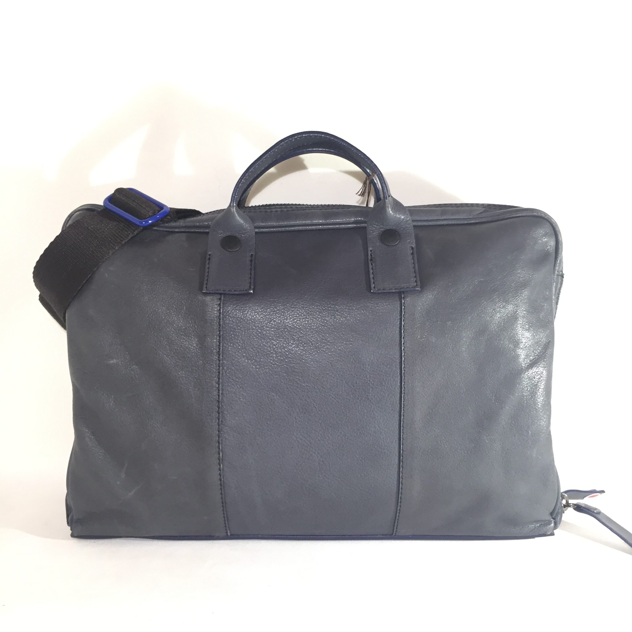 Borsa in pelle blu con tracolla in tessuto regolabile. Interno in neoprene/tessuto suddiviso in tre scomparti: centrale chiuso tramite zip per tablet/notebook e due laterali con tasca porta cellulare e due ulteriori taschine chiuse.