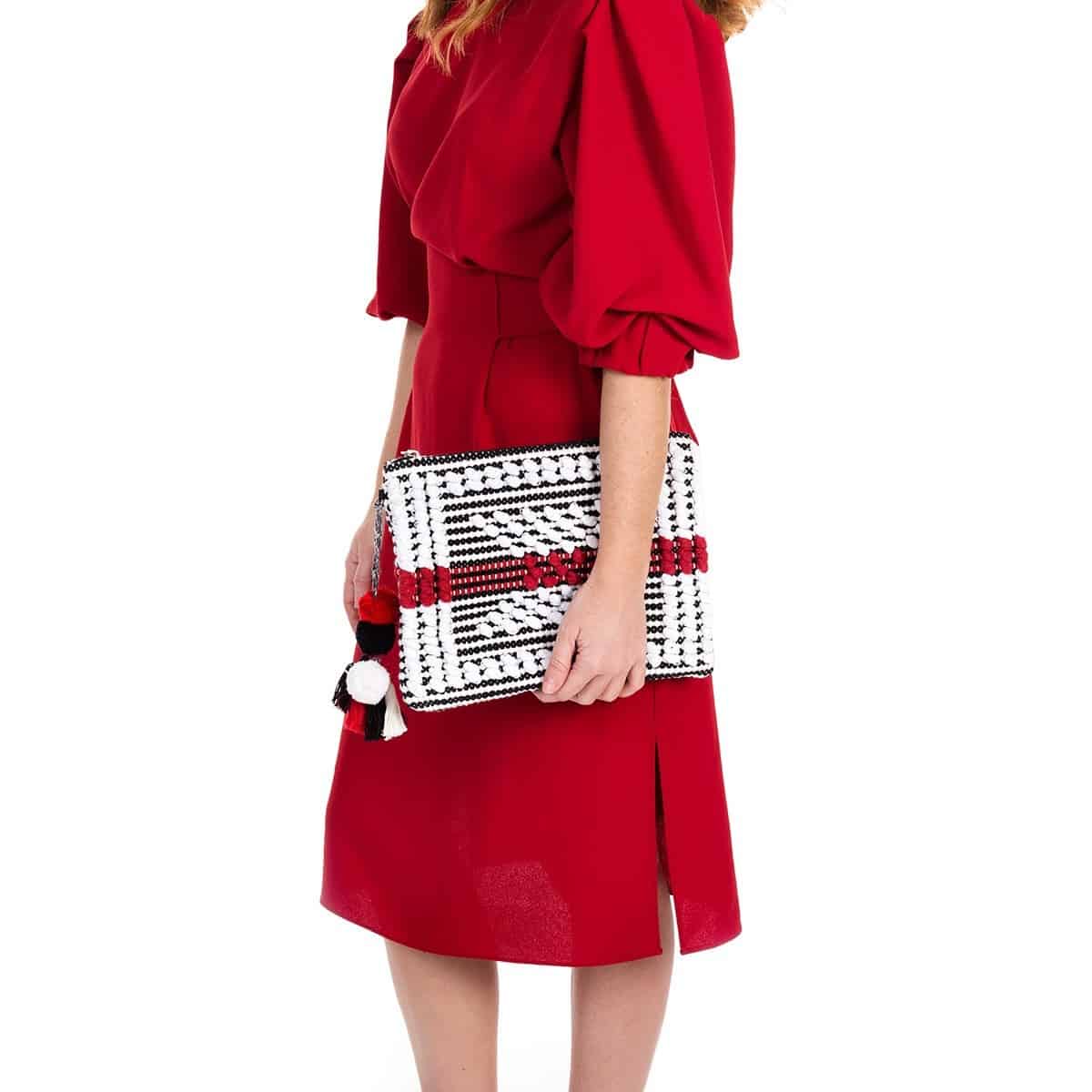 Pochette d’ispirazione etnica con ricami in bianco e nero e dettaglio rosso. Chiusura con cerniera. Dettaglio di nappe e pomponi. Una tasca interna.