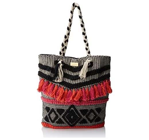 Gioseppo shopper in tessuto intrecciato bianco e nero. Dettaglio frange fuxia/arancio. Tasca interna portacellulare.