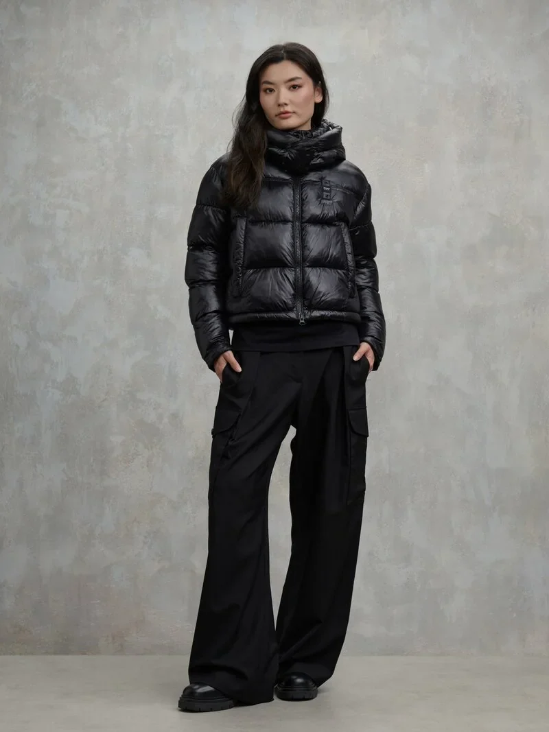 Giubbetto invernale in nylon micro rip idrorepellente con colletto alto removibile. Imbottitura sostenibile con impuntura a righe orizzontali con interno in contrasto colore per abbinare il giubbetto con eleganza e calore.