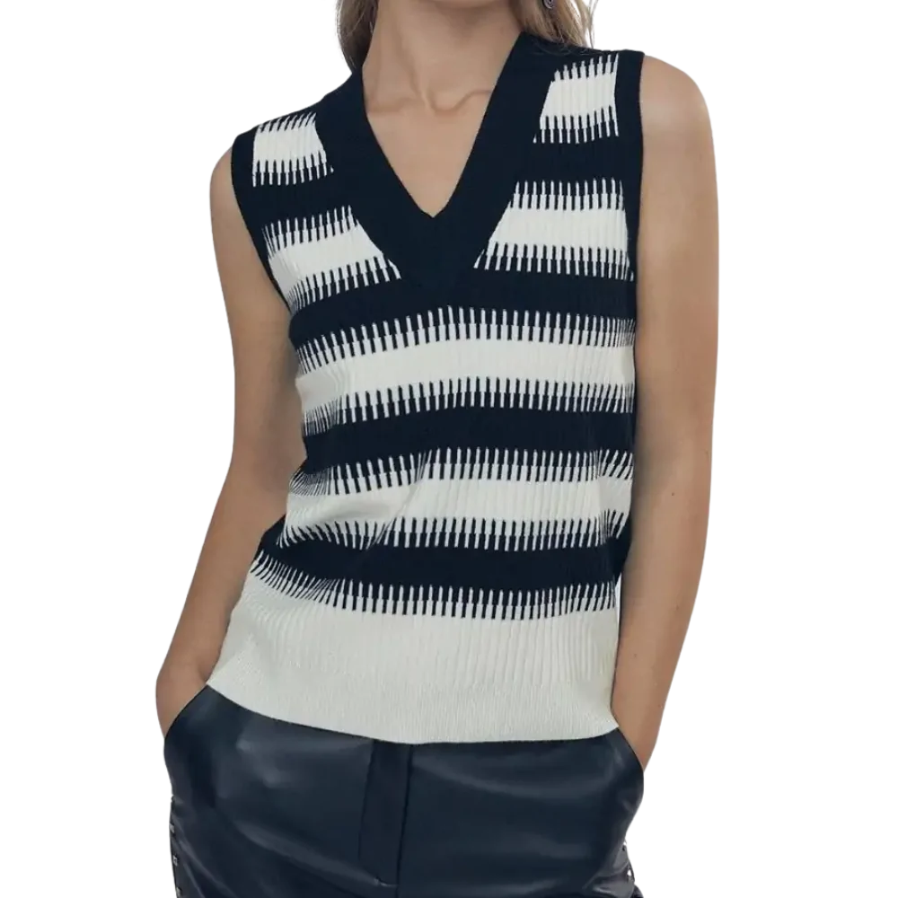 Top in maglia bicolore con manica a giro. Scollo a v.