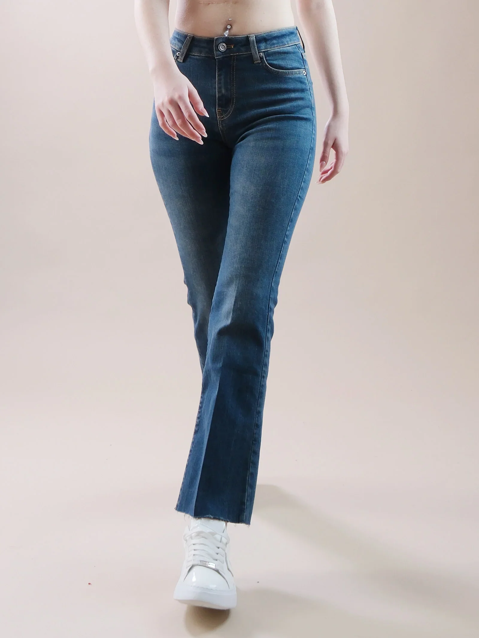 Jeans a vita media con fondo a zampa nero. Modello cropped. Modello cinque tasche. Chiusura frontale con zip e bottone. Dettaglio fondo leggermente sfrangiato.