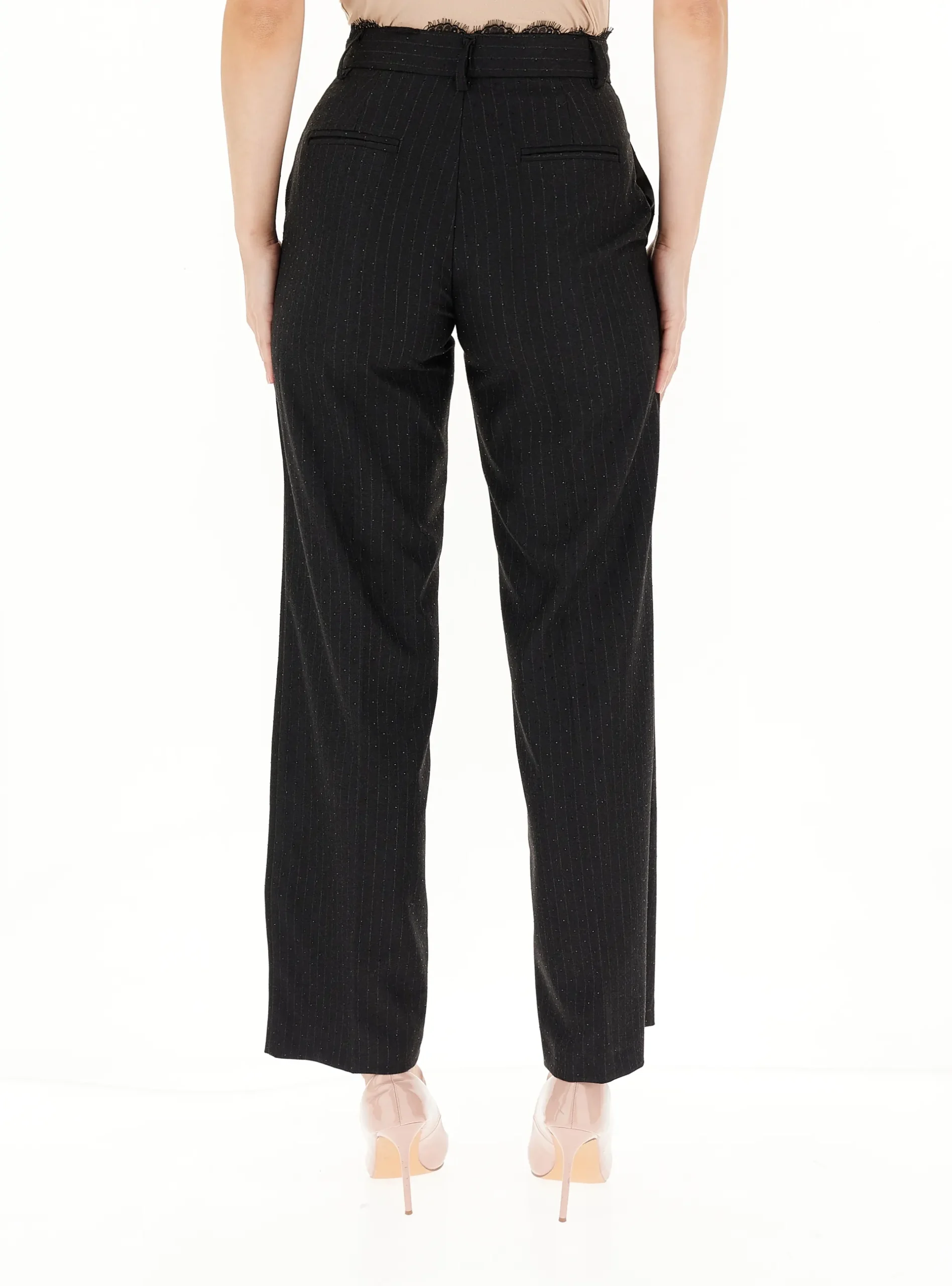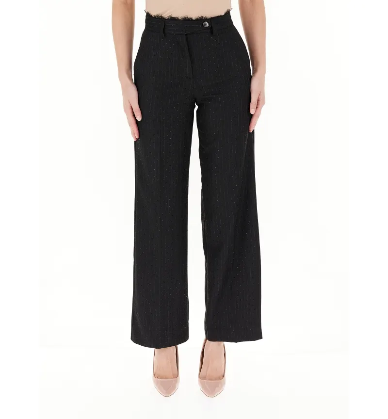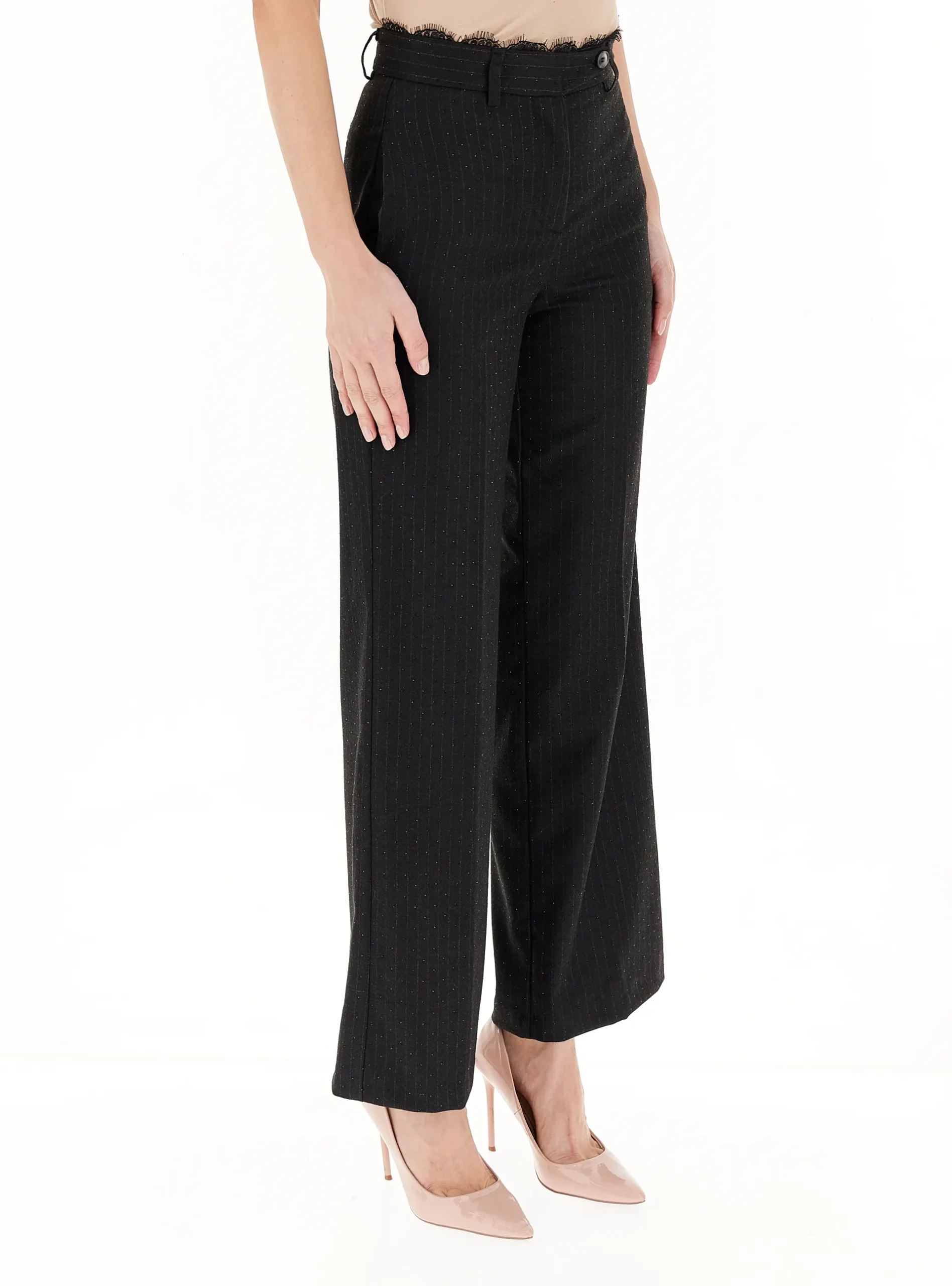Pantalone a palazzo con strass all-over, inserto in pizzo sul girovita, chiusura frontale con zip e bottone, due tasche sul davanti e due finte tasche sul retro, passanti in vita