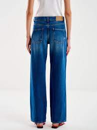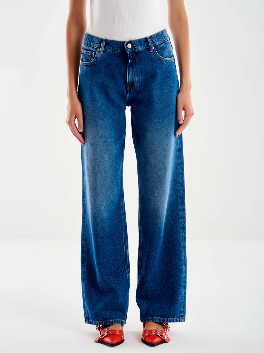 Jeans a vita regolare in denim effetto slavato. Modello cinque tasche. Gamba larga extra lunga. Chiusura frontale con zip e bottone. Icon Fit: Alex Composizione Cotone 100% La modella รจ alta 177 cm e indossa la taglia S.