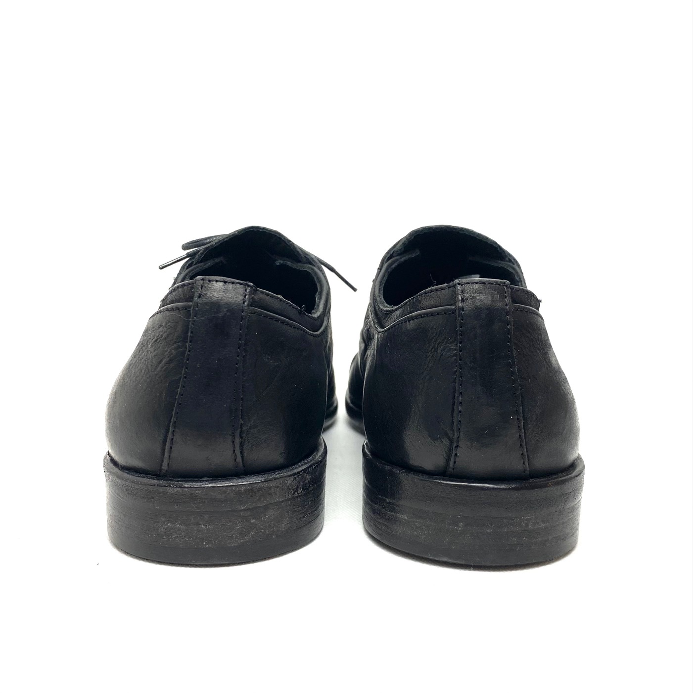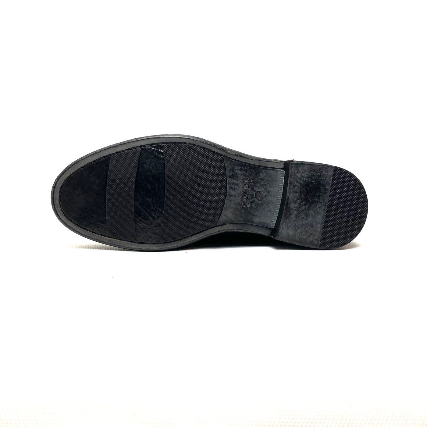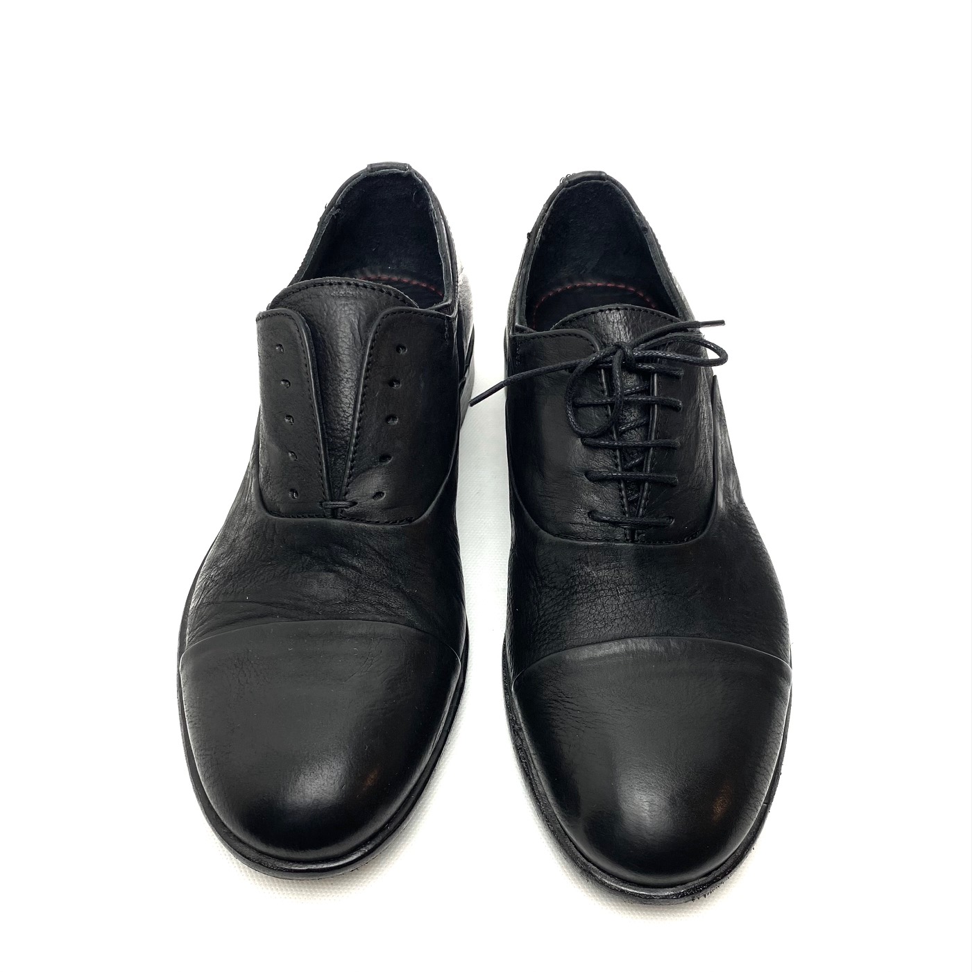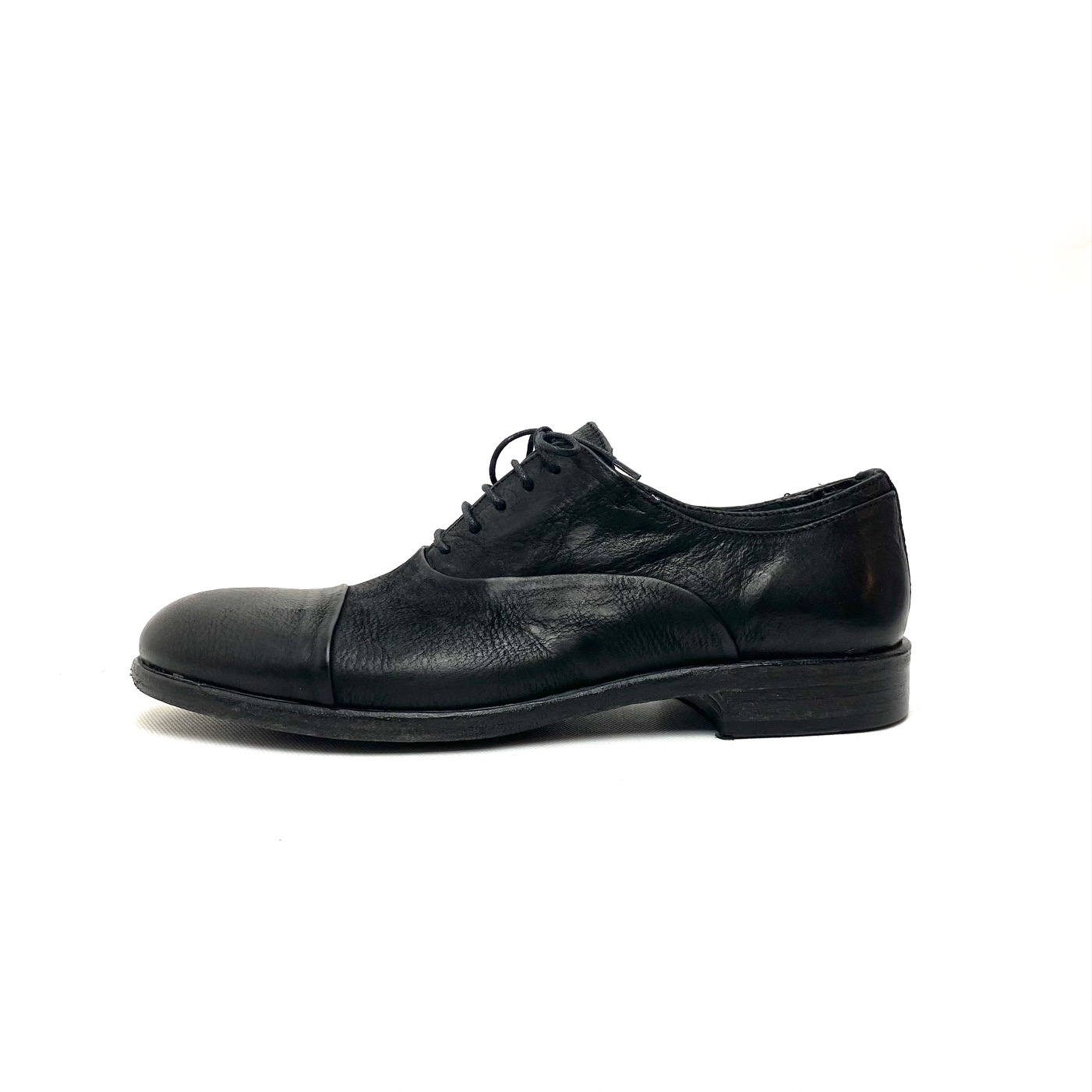 Scarpa indossabile con e senza lacci, in pelle nera invecchiata. Fodera pelle suola cuoio e gomma. 100% Made in Italy