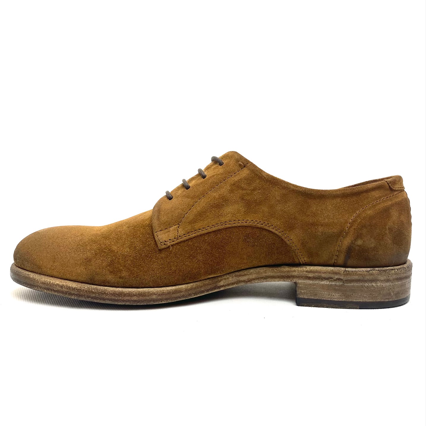 Scarpa derby 4 fori in camoscio cognac invecchiato, fodera pelle, suola cuoio e gomma, 100% Made in Italy