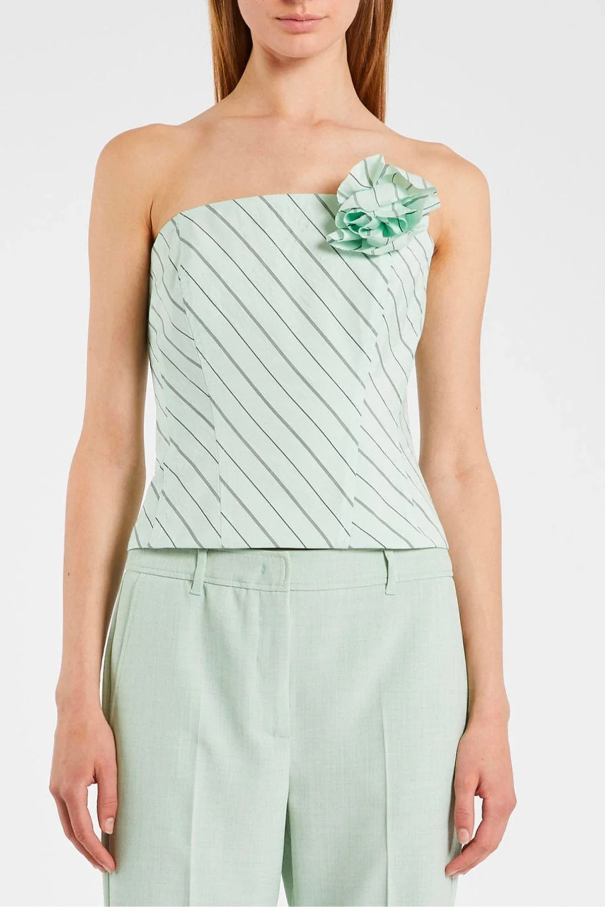 Esplora uno stile elegante e raffinato con questo top verde giada da donna Marella. Caratterizzato da un dettaglio fiore a clip sul davanti, questo top senza spalline porta un tocco di femminilitร e originalitร al tuo guardaroba. Perfetto per un look estivo chic e versatile.