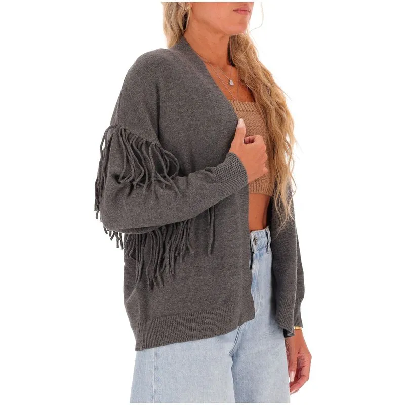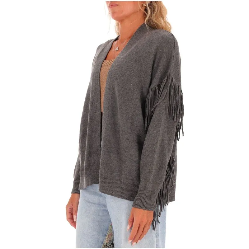Cardigan lungo in maglia misto viscosa dalla linea over con dettaglio di frange in maglia applicate. Collo a scialle, maniche lunghe con giro sceso e polsino. Senza chiusura.