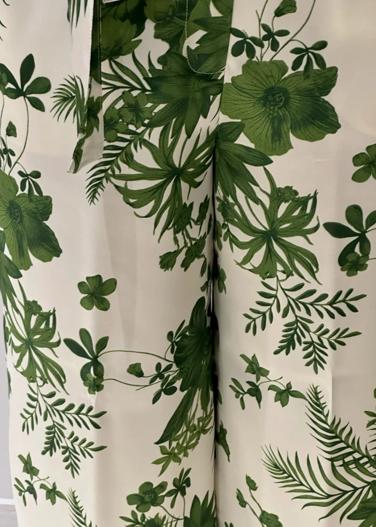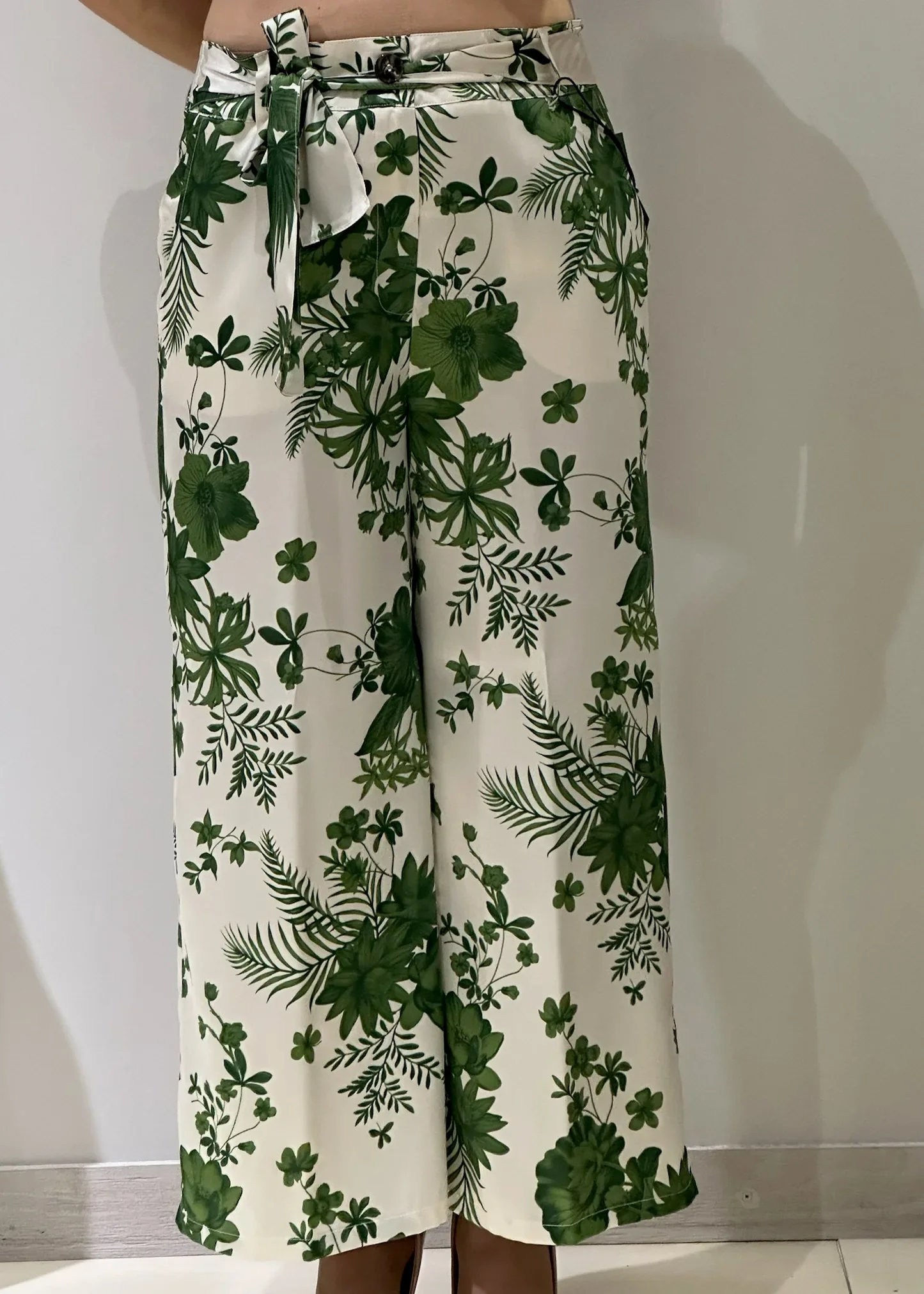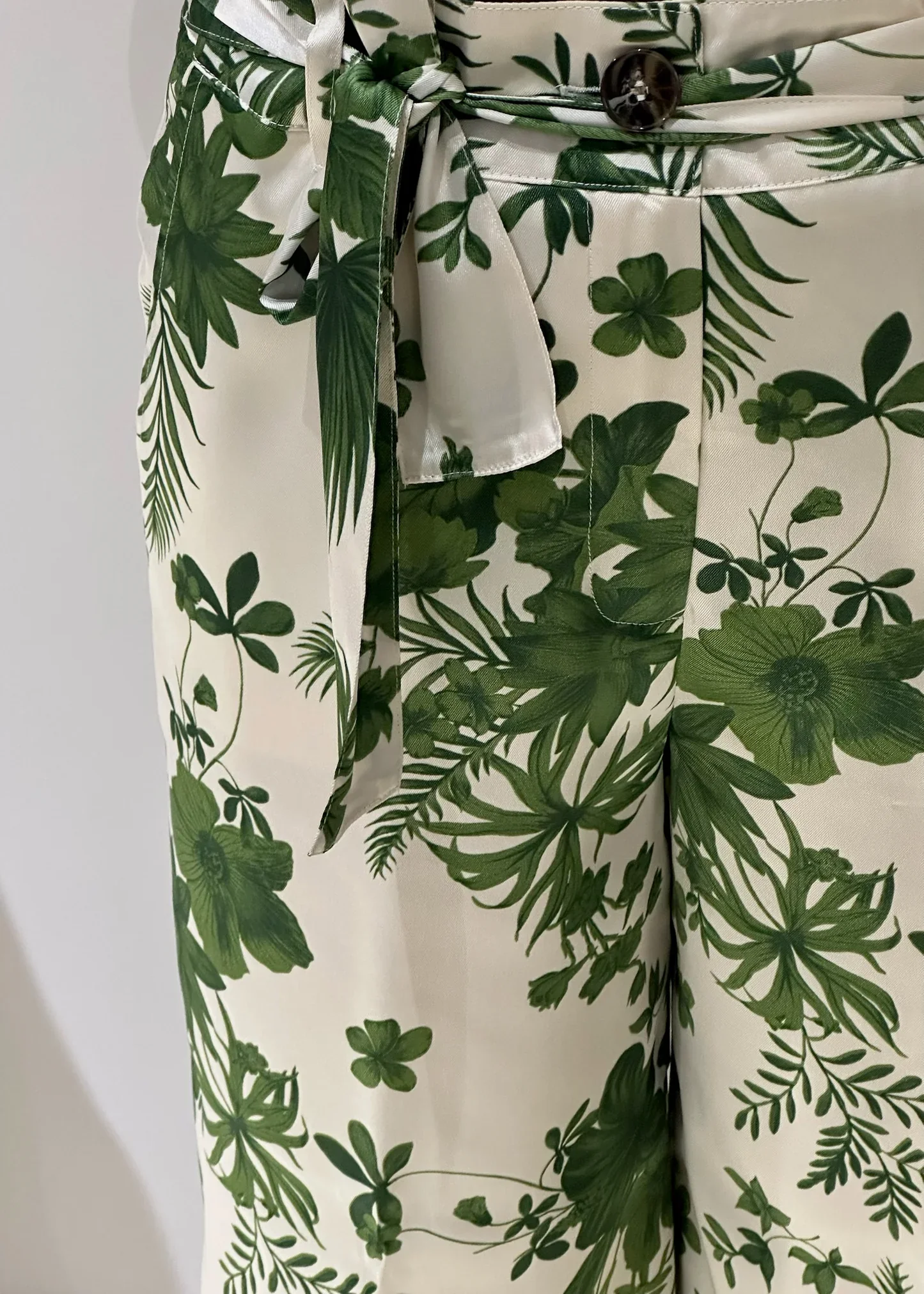 Ondeggia ad ogni passo e slancia la silhouette questo pantalone in twill decorato con una macro stampa foliage bicolore. La cintura coordinata in vita aggiunge una nota leggera, perfetta per la bella stagione.