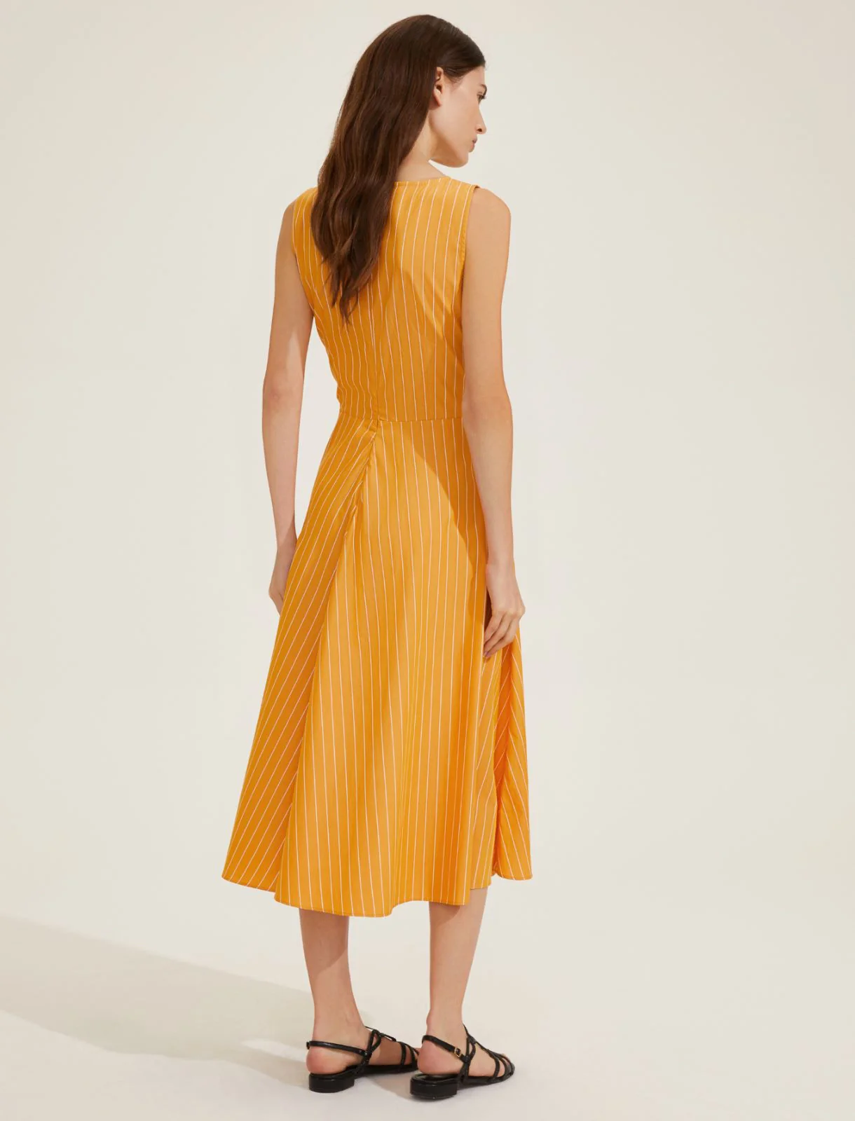 – Vita: La cintura in vita accentua la forma del corpo, mentre la falda ampia si apre dolcemente verso il basso, donando movimento e fluiditร .
