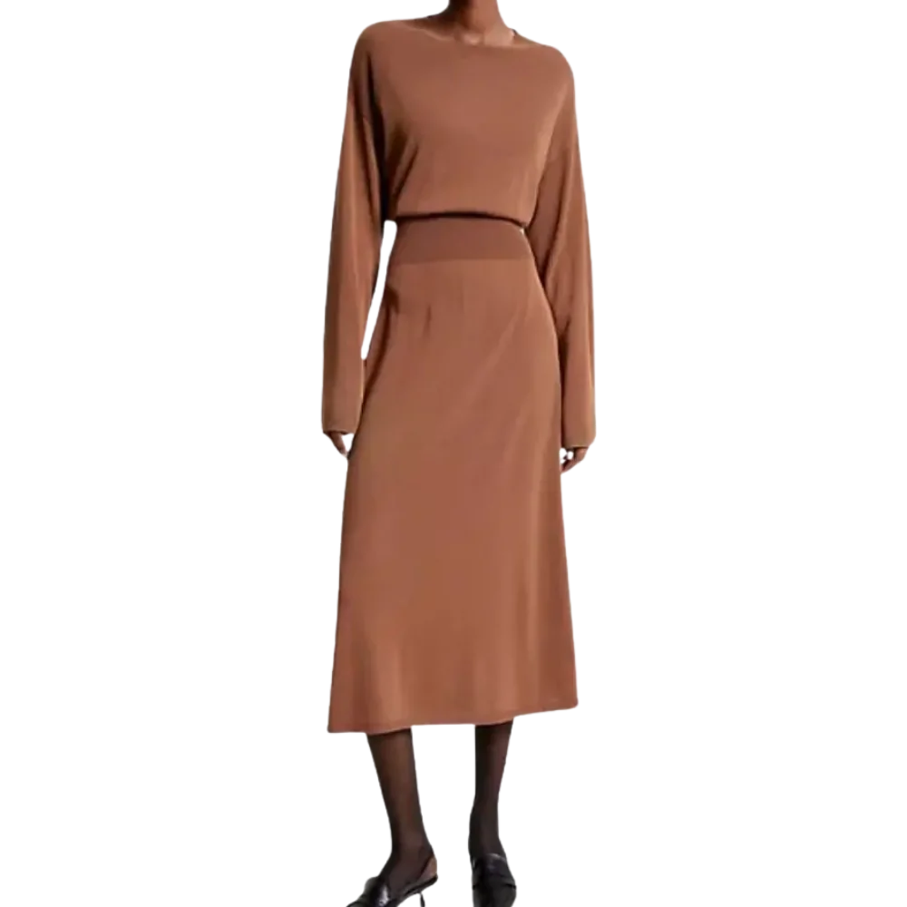 L’abito relaxed fit in morbido jersey, stretto in vita e con la gonna ampia, sa come unire comfort e raffinatezza.