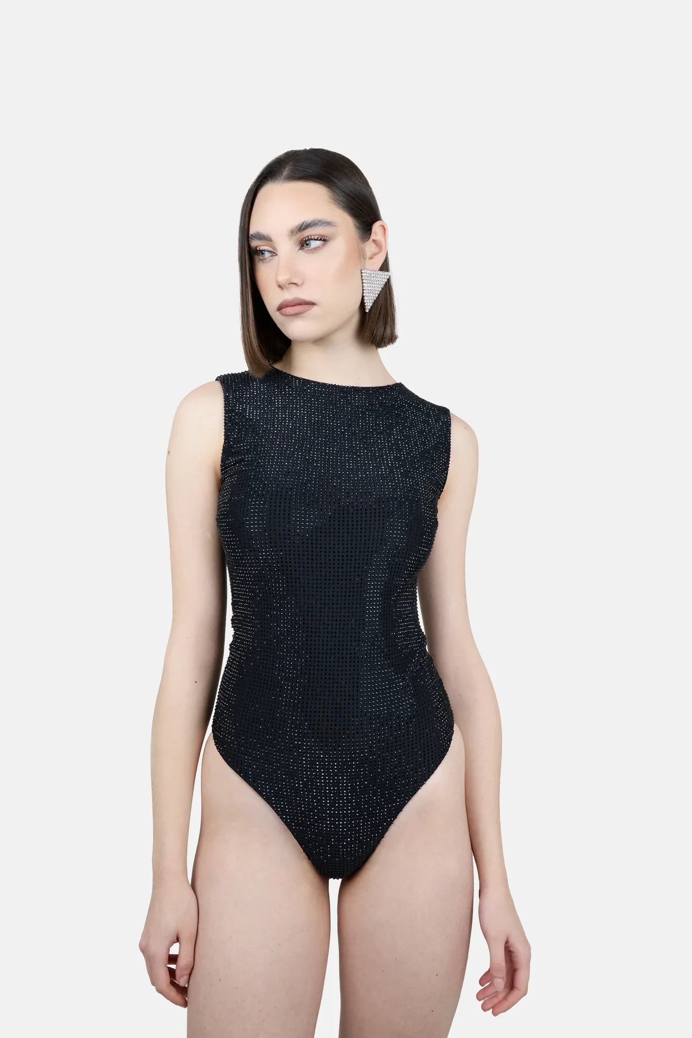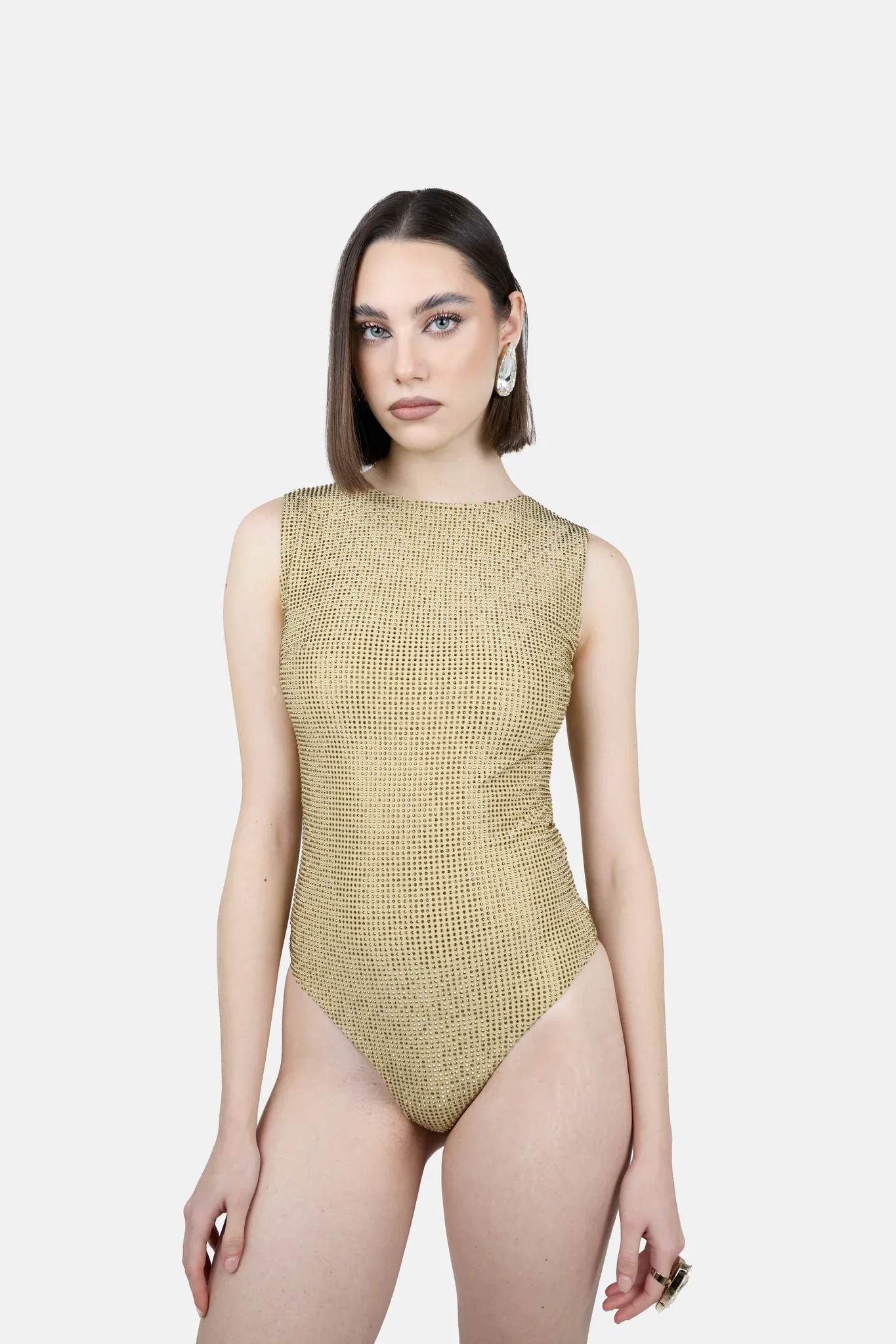 Descrizione: Body Scollo Americana In Tessuto Elastico Ricoperto Di Strass Vestibilitร : Regolare Altezza modella: 171cm Indossa tg40