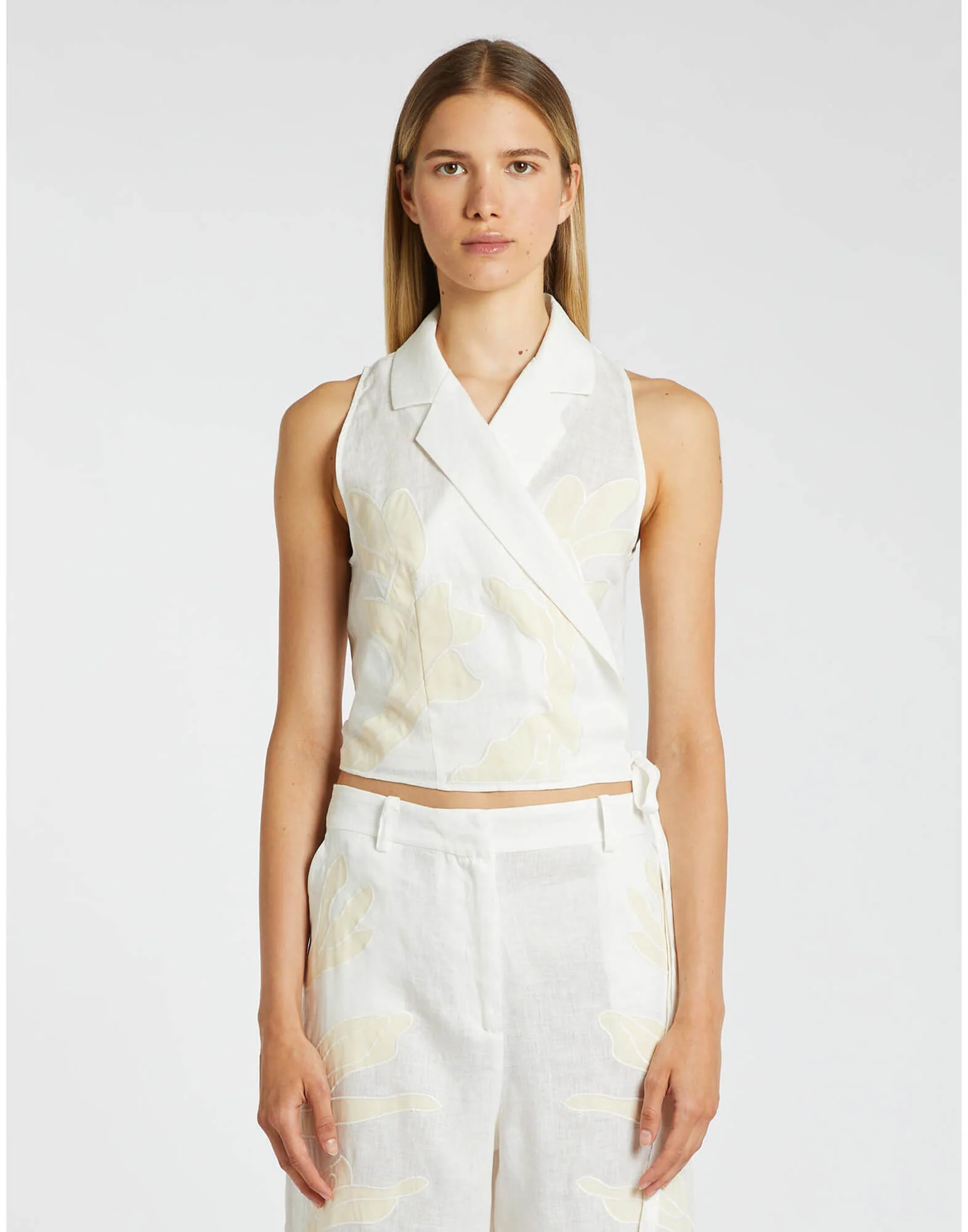 Gilet in puro lino. Fit regolare. Scollo con rever. Costruzione incrociata sul davanti, con lacci da annodare lateralmente. Modello sfoderato